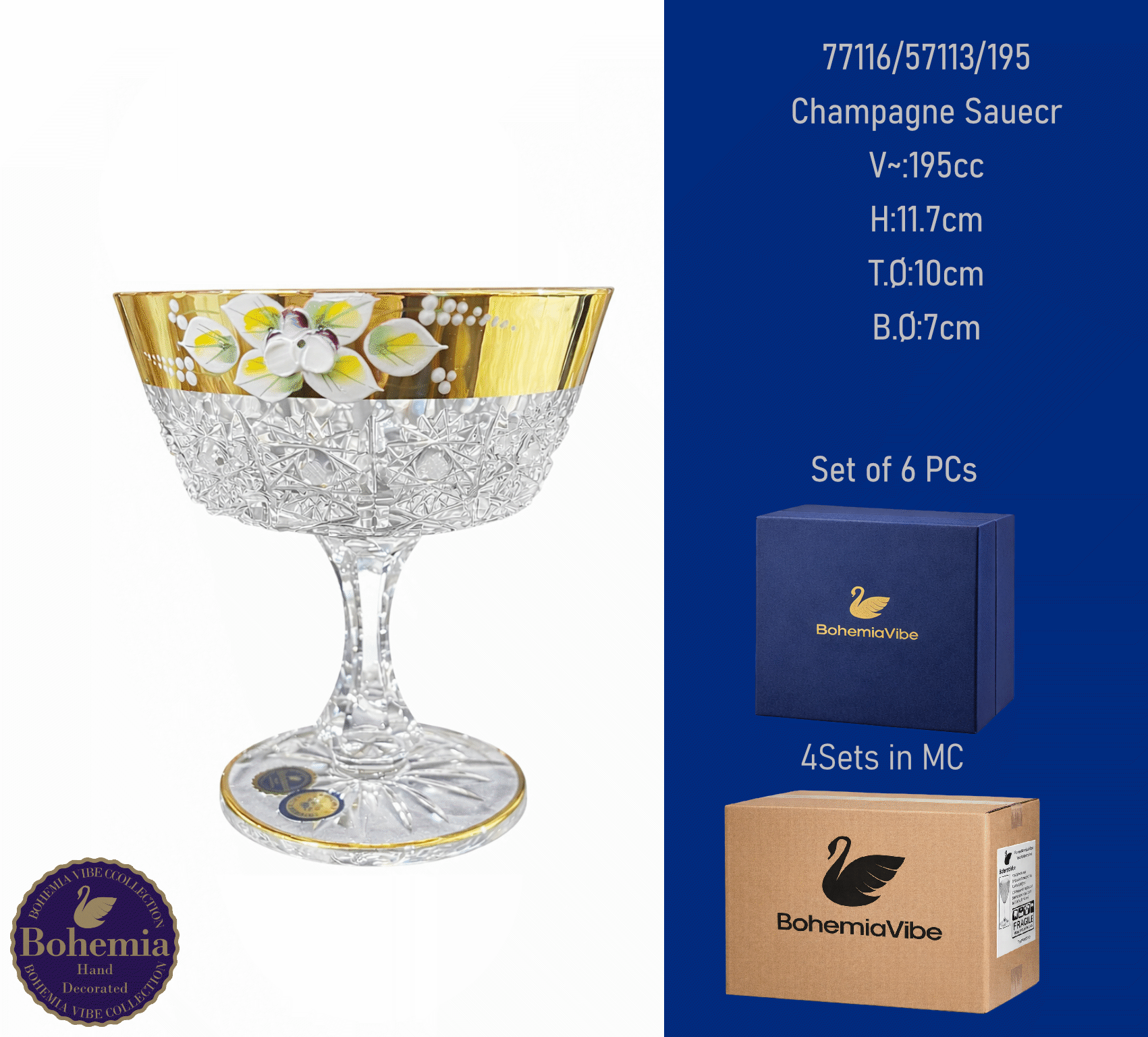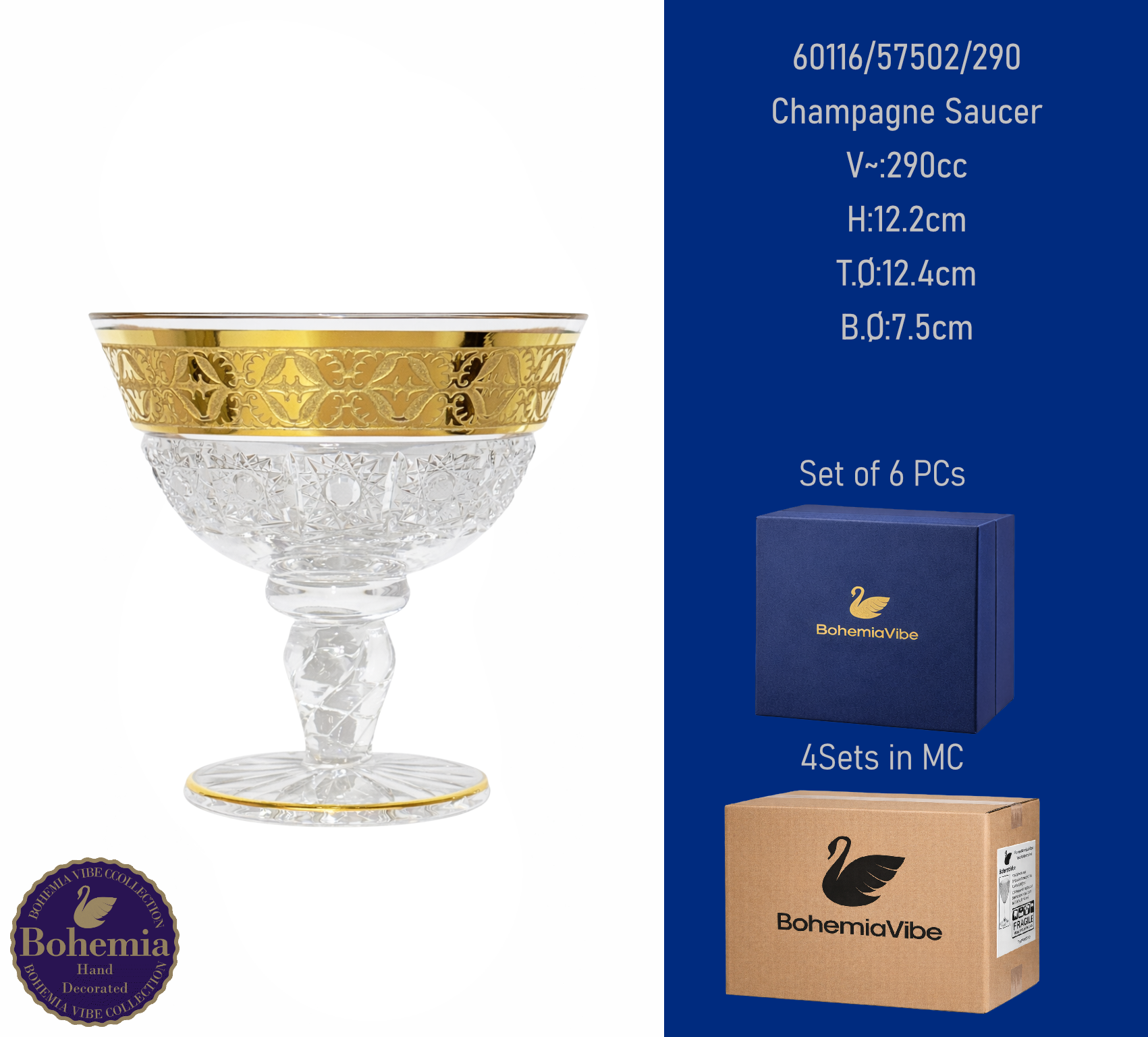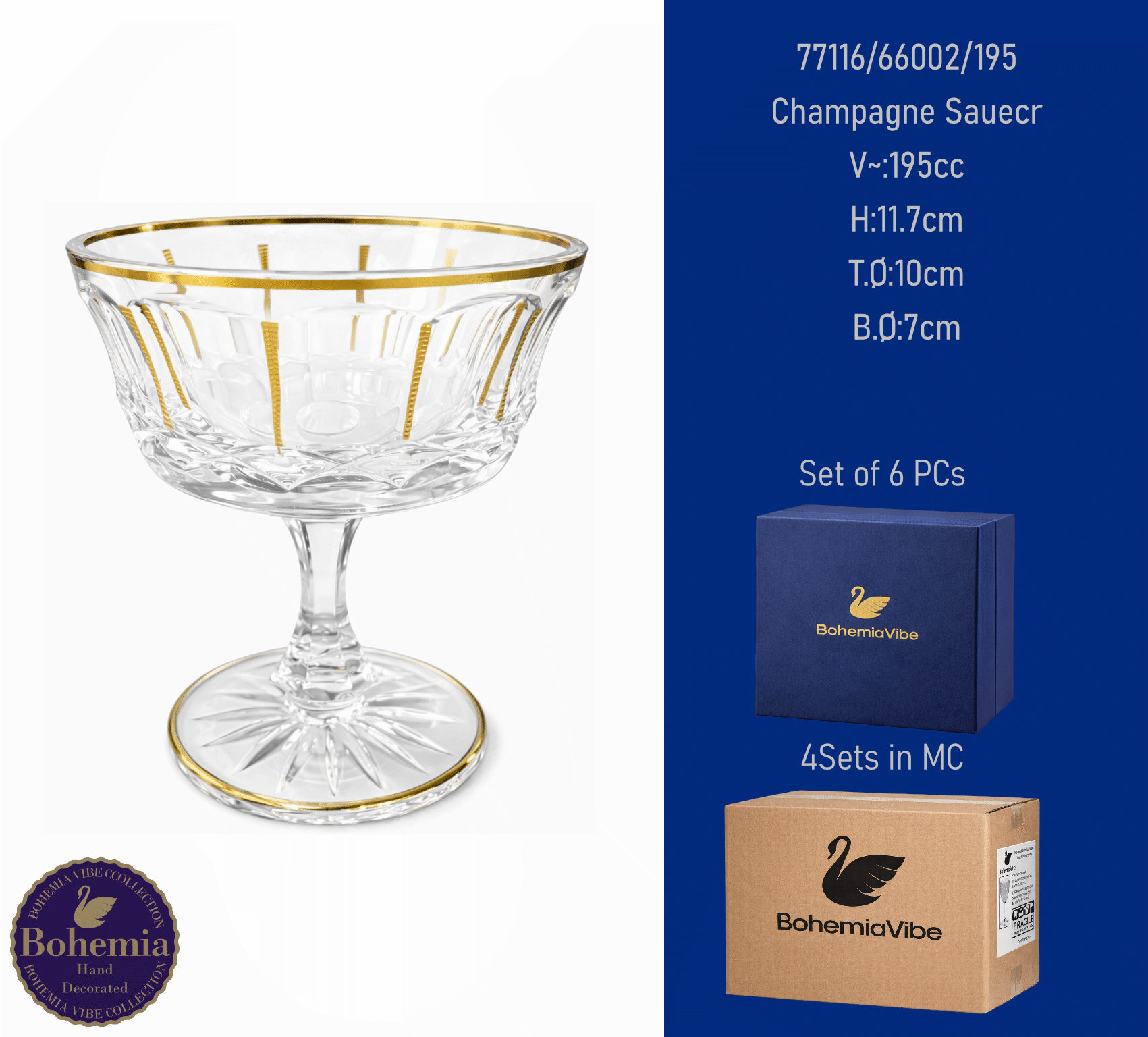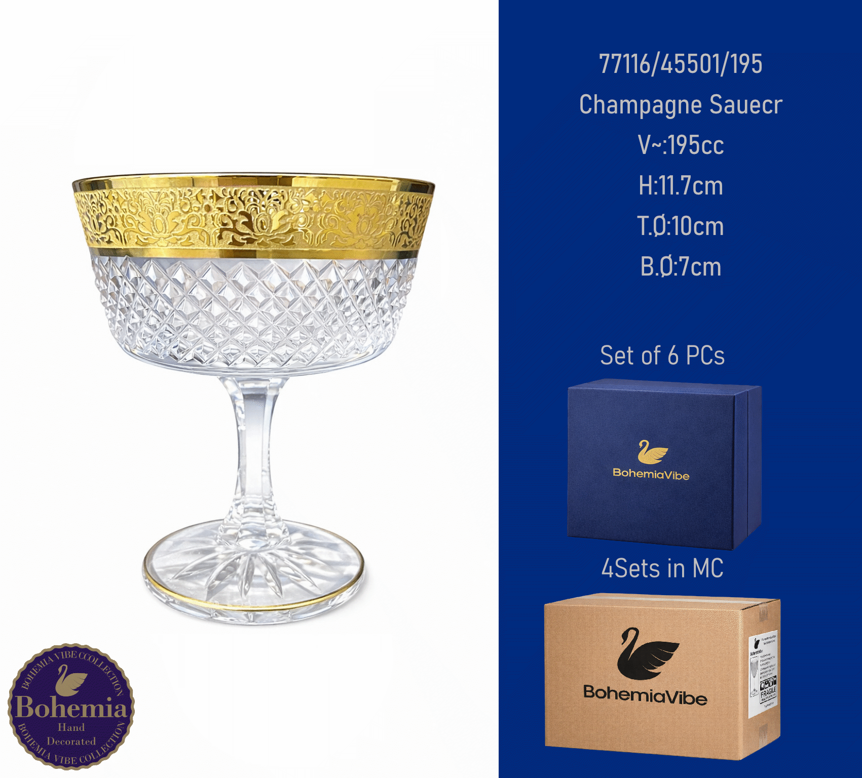 Champagne Saucer V~:290cc H:11.4cm T.Ø:11.8cm B.Ø:7.4cm Cutting with gold sandblasting