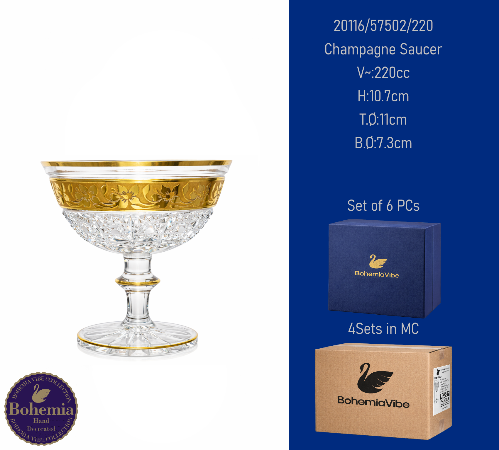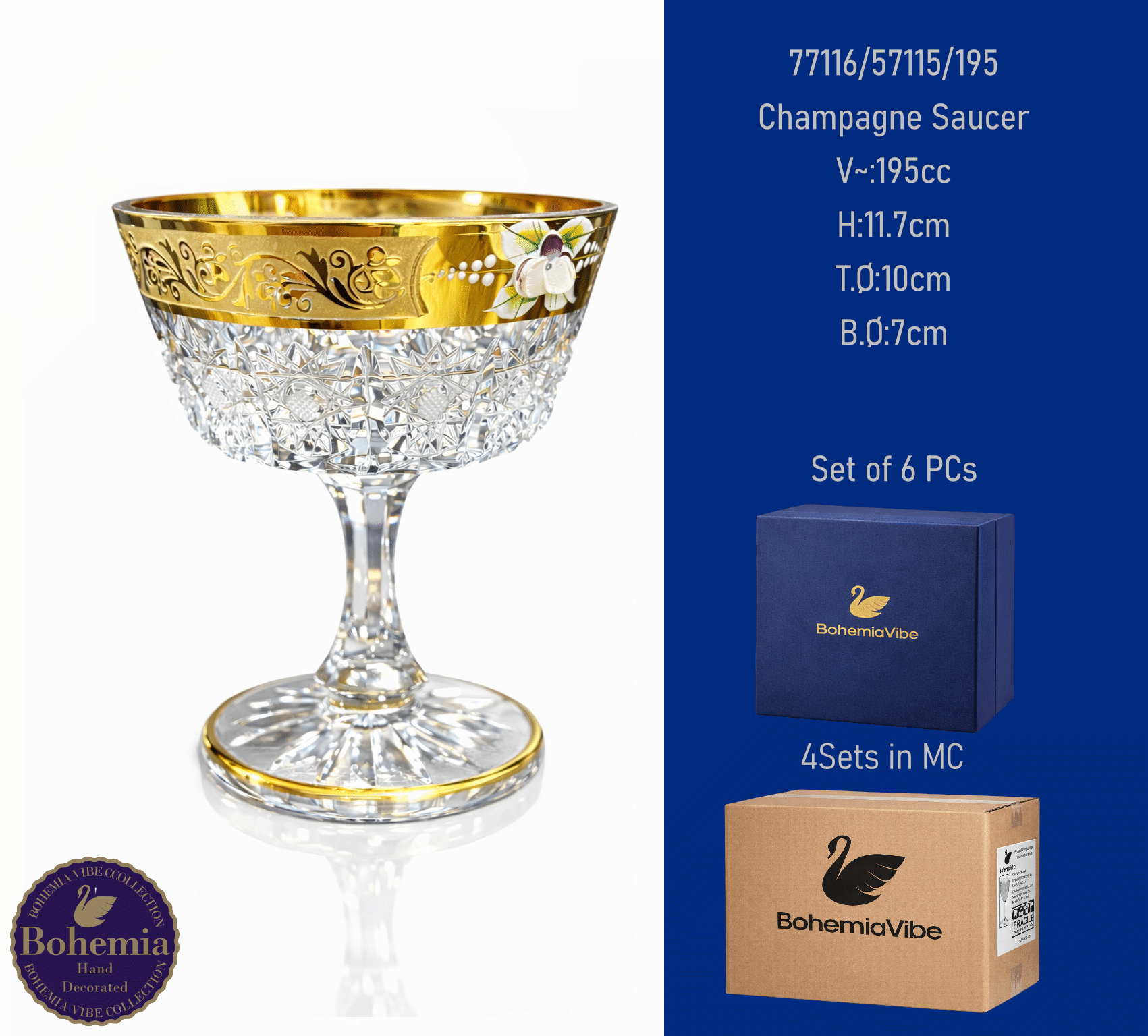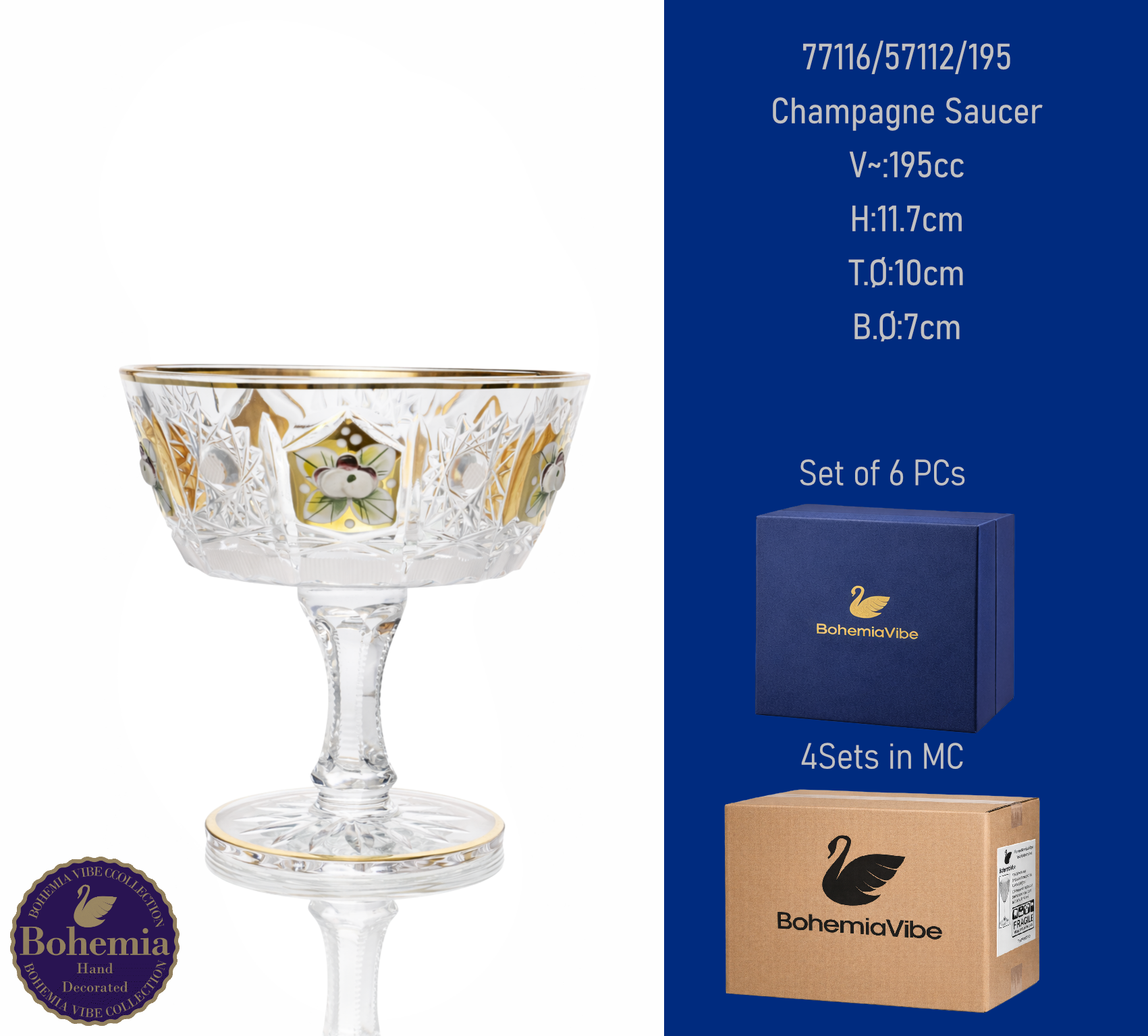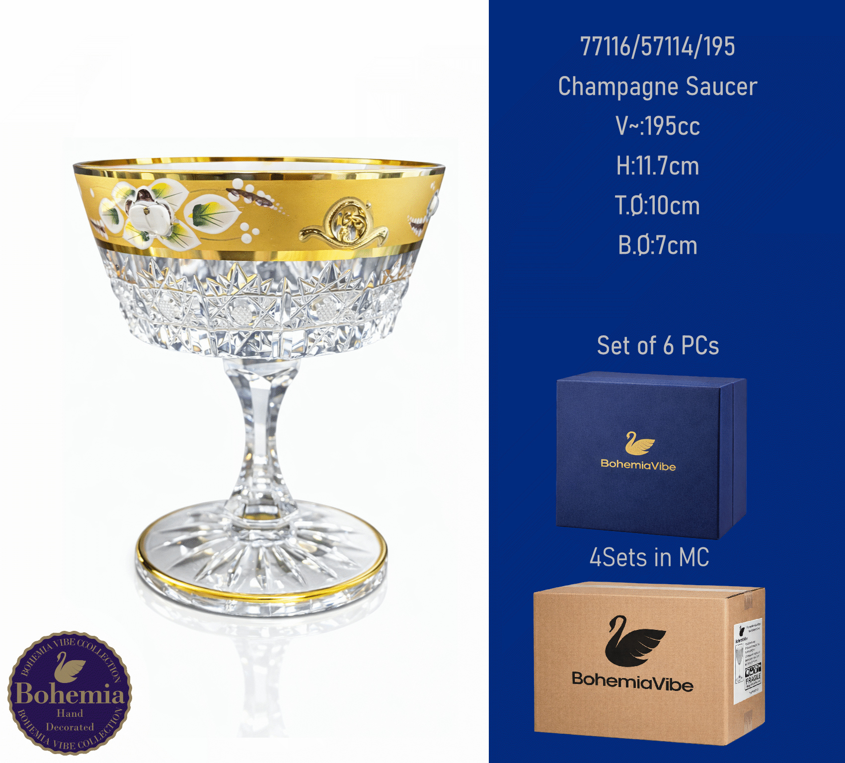Champagne Saucer V~:290cc H:11.4cm T.Ø:11.8cm B.Ø:7.4cm Cutting with gold sandblasting
