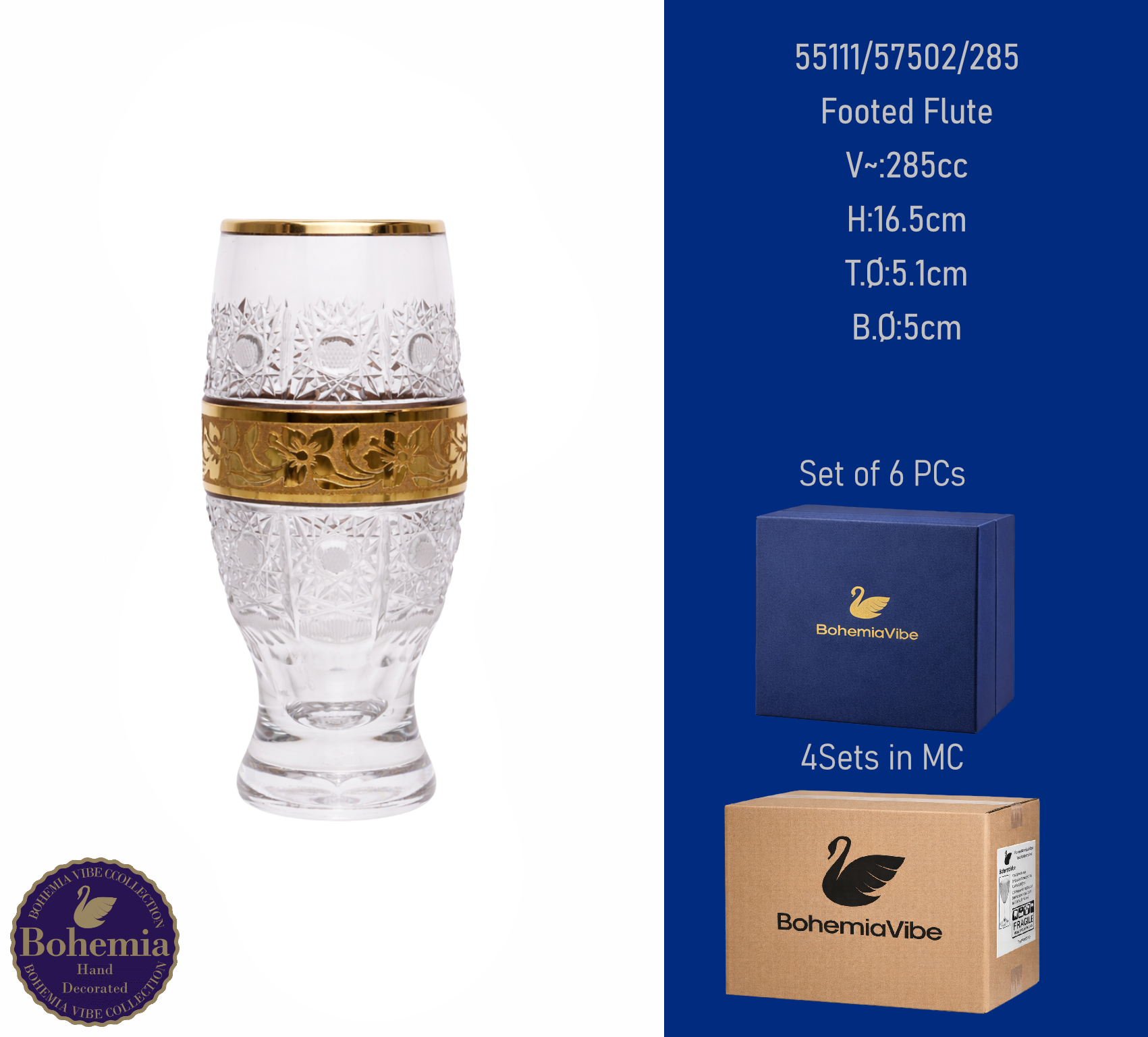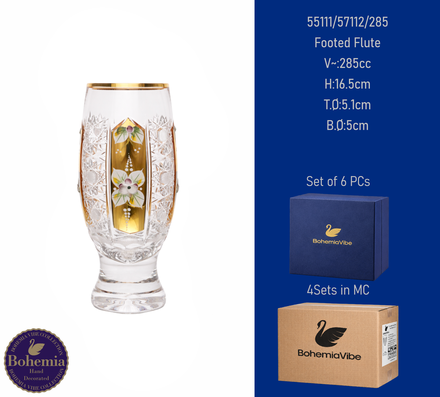 Footed Flute V~:285cc H:16.5cm T.Ø:5.1cm B.Ø:5cm PK500 cut with gold and enamel painting vertical