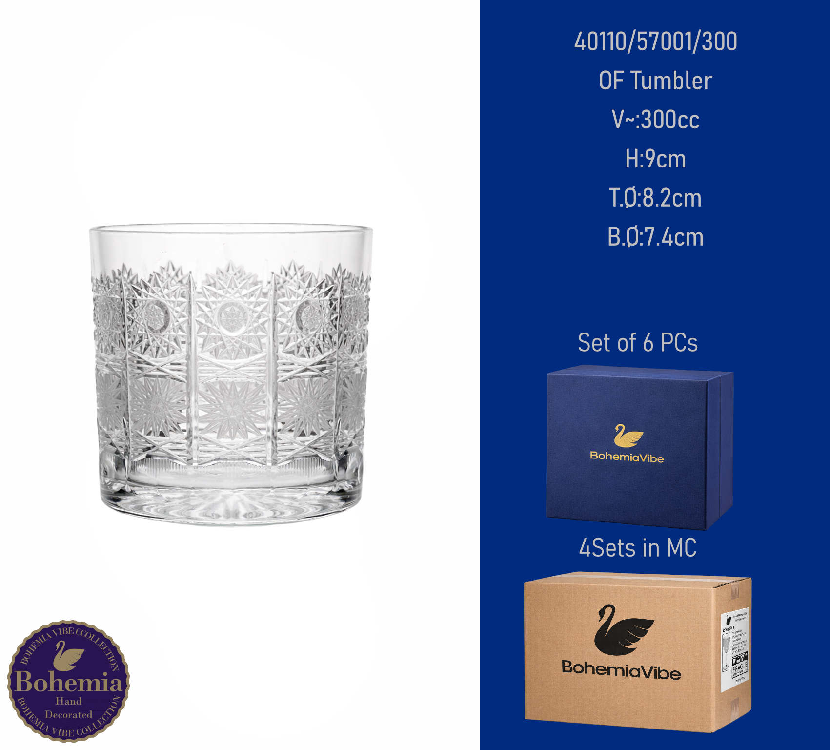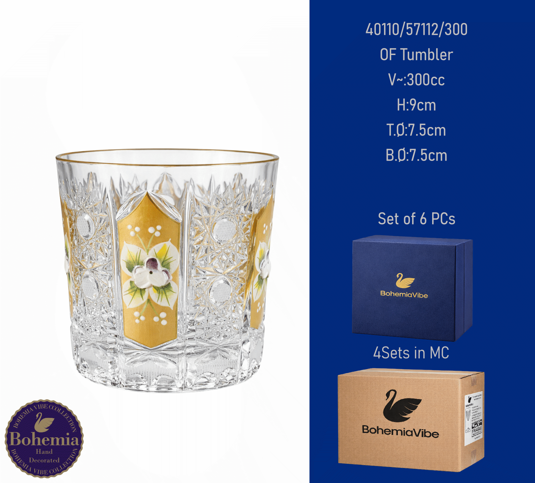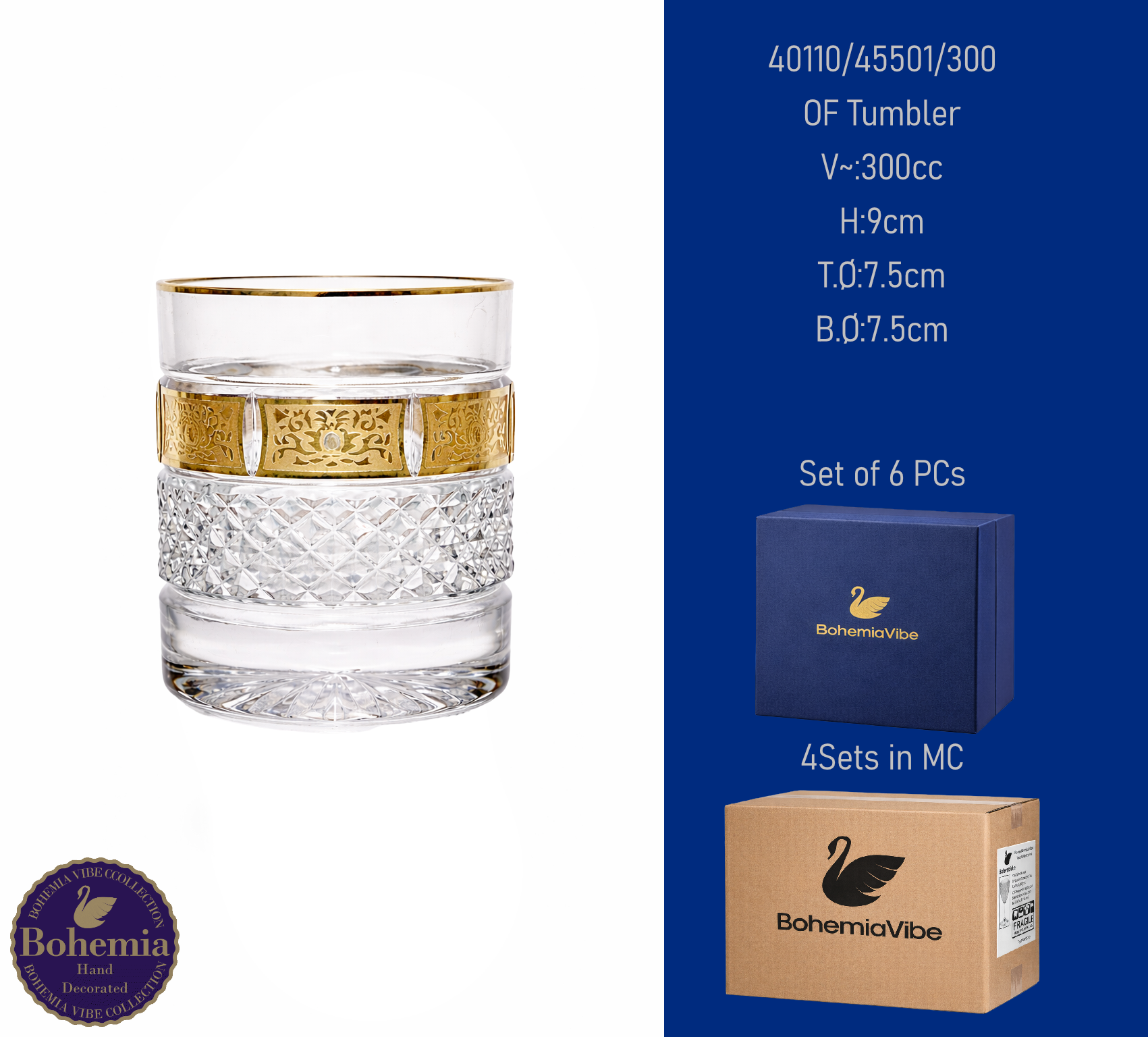 OF Tumbler V~:300cc H:9cm T.Ø:7.5cm B.Ø:7.5cm Cutting with gold sandblasting