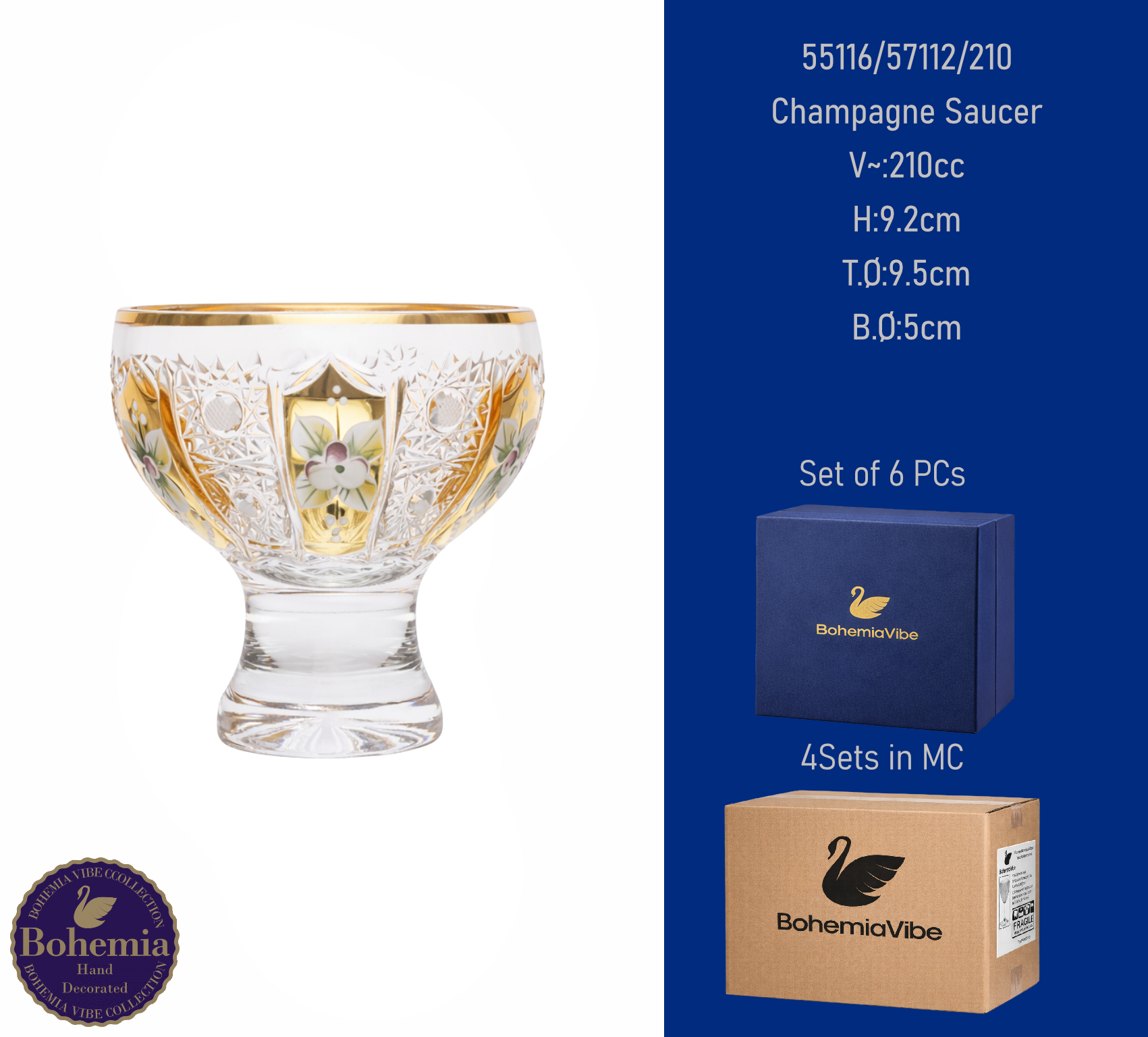 Champagne Saucer V~:210cc H:9.2cm T.Ø:9.5cm B.Ø:5cm PK500 cut with gold and enamel painting vertical