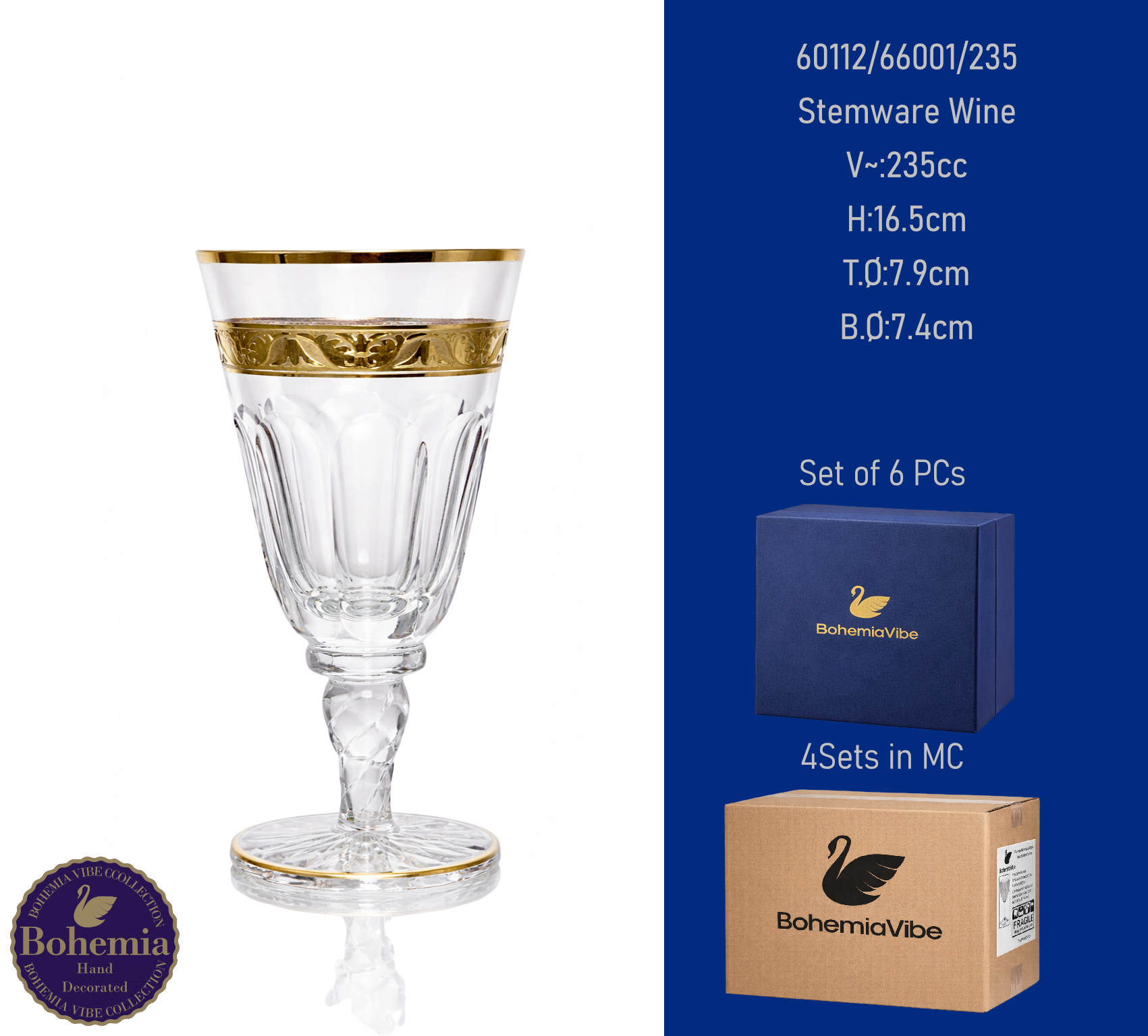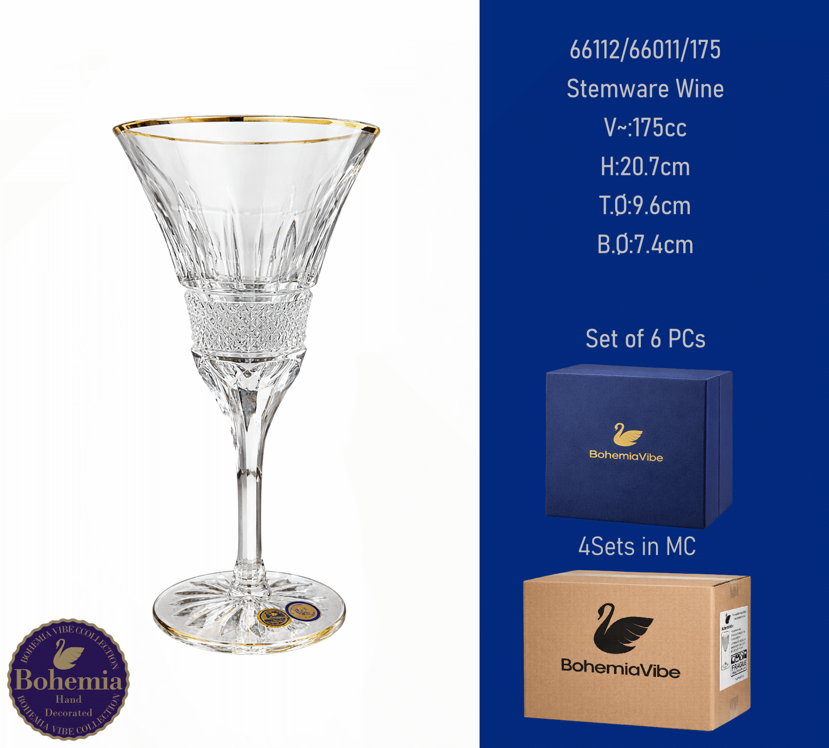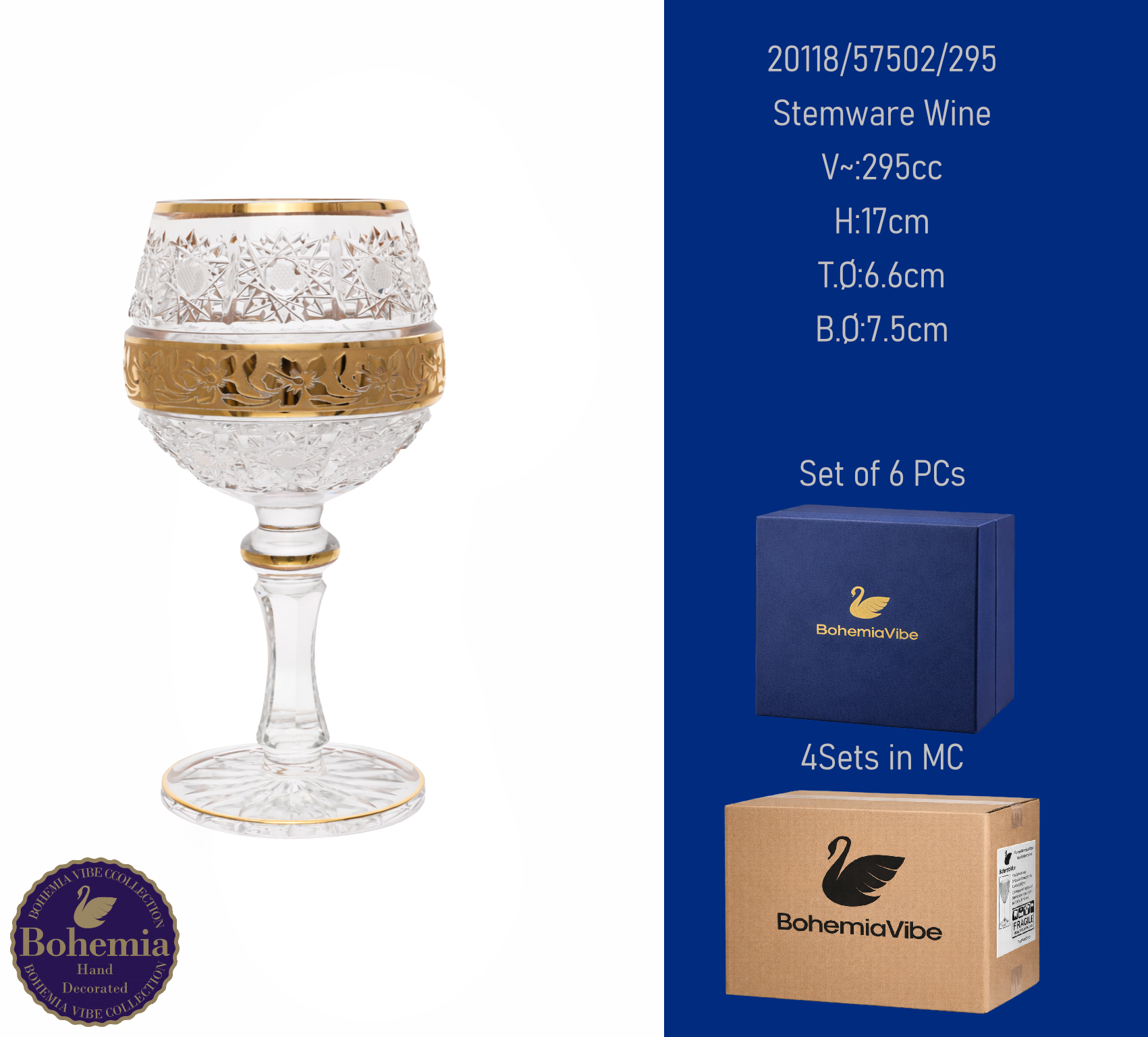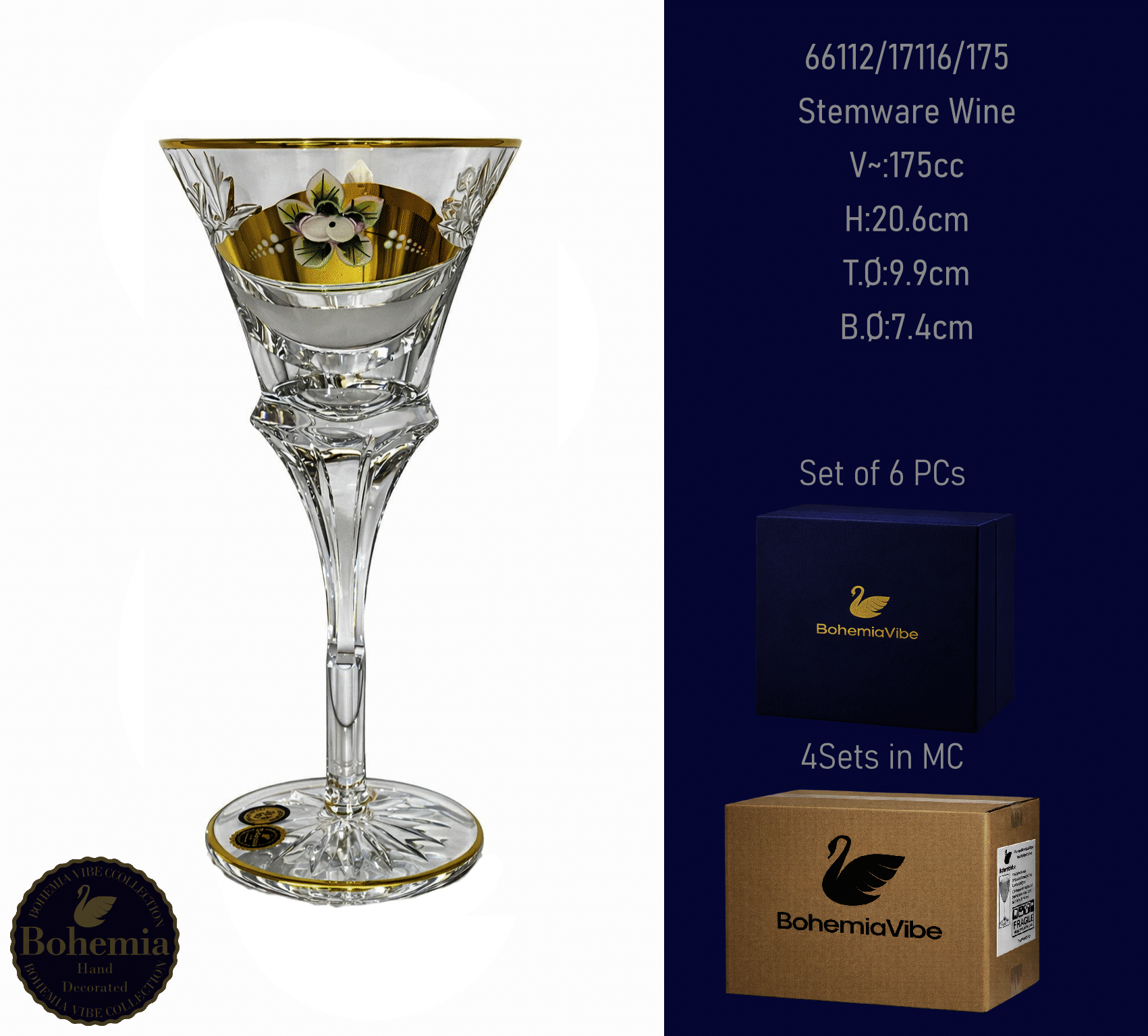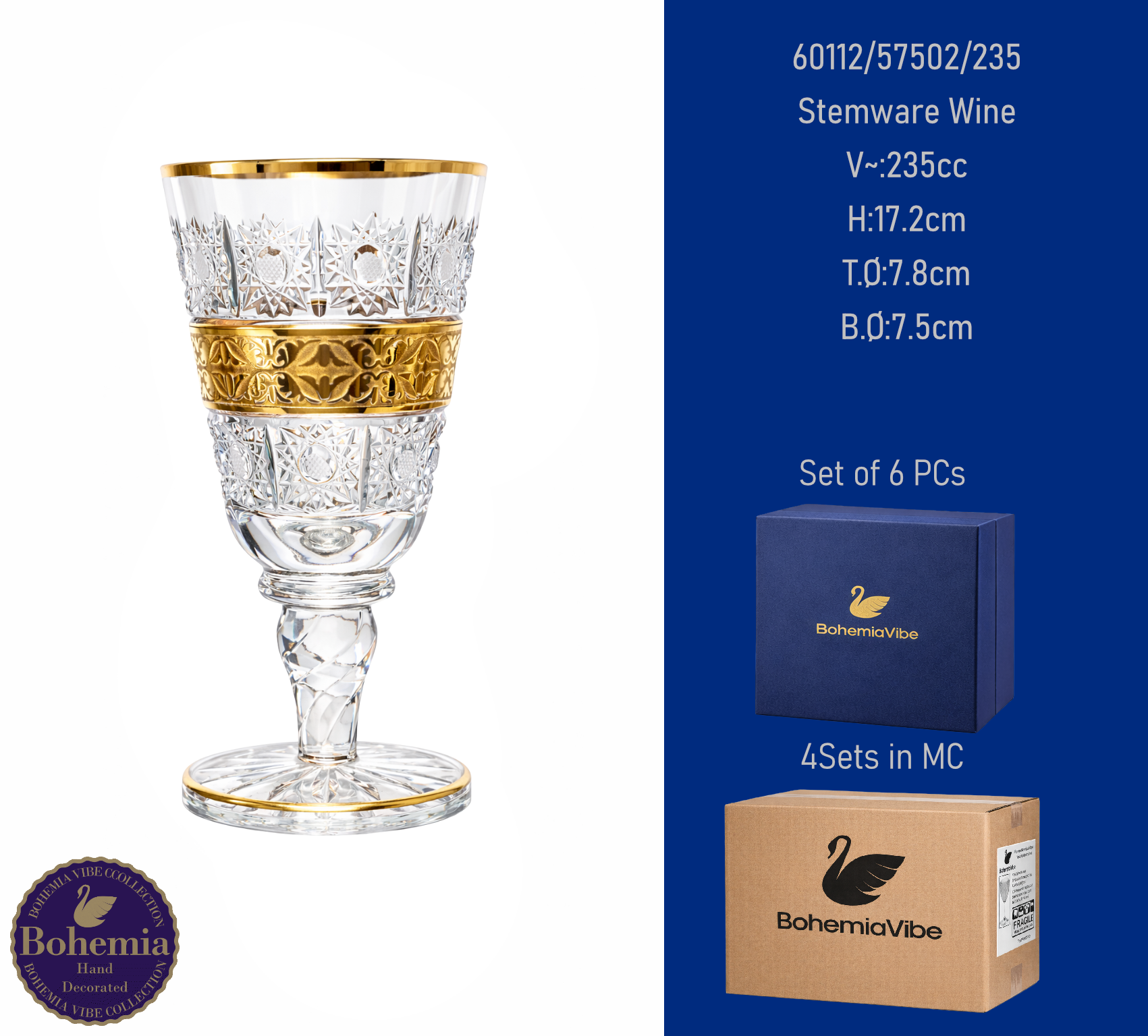 Stemware Wine V~:235cc H:17.2cm T.Ø:7.8cm B.Ø:7.5cm Cutting with gold sandblasting