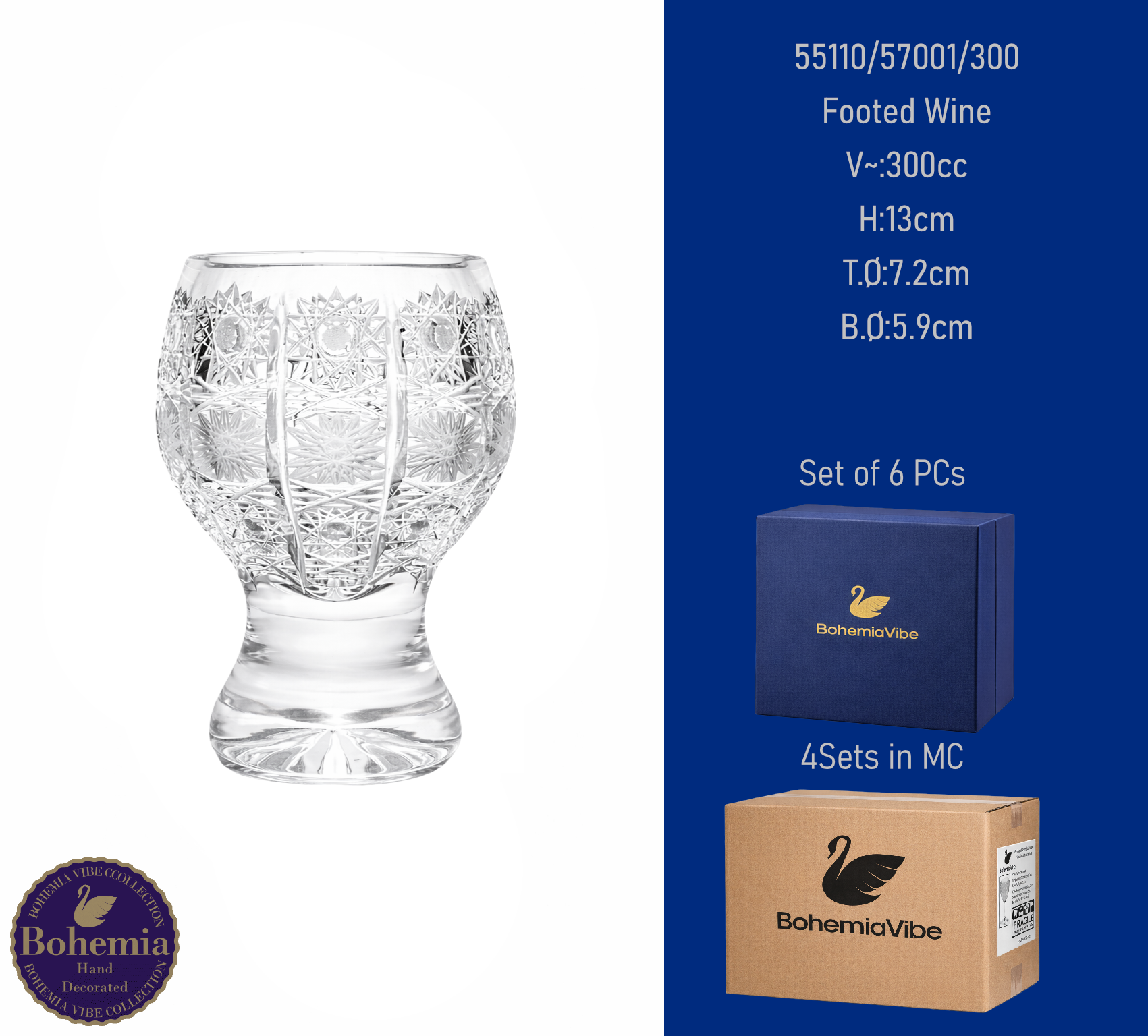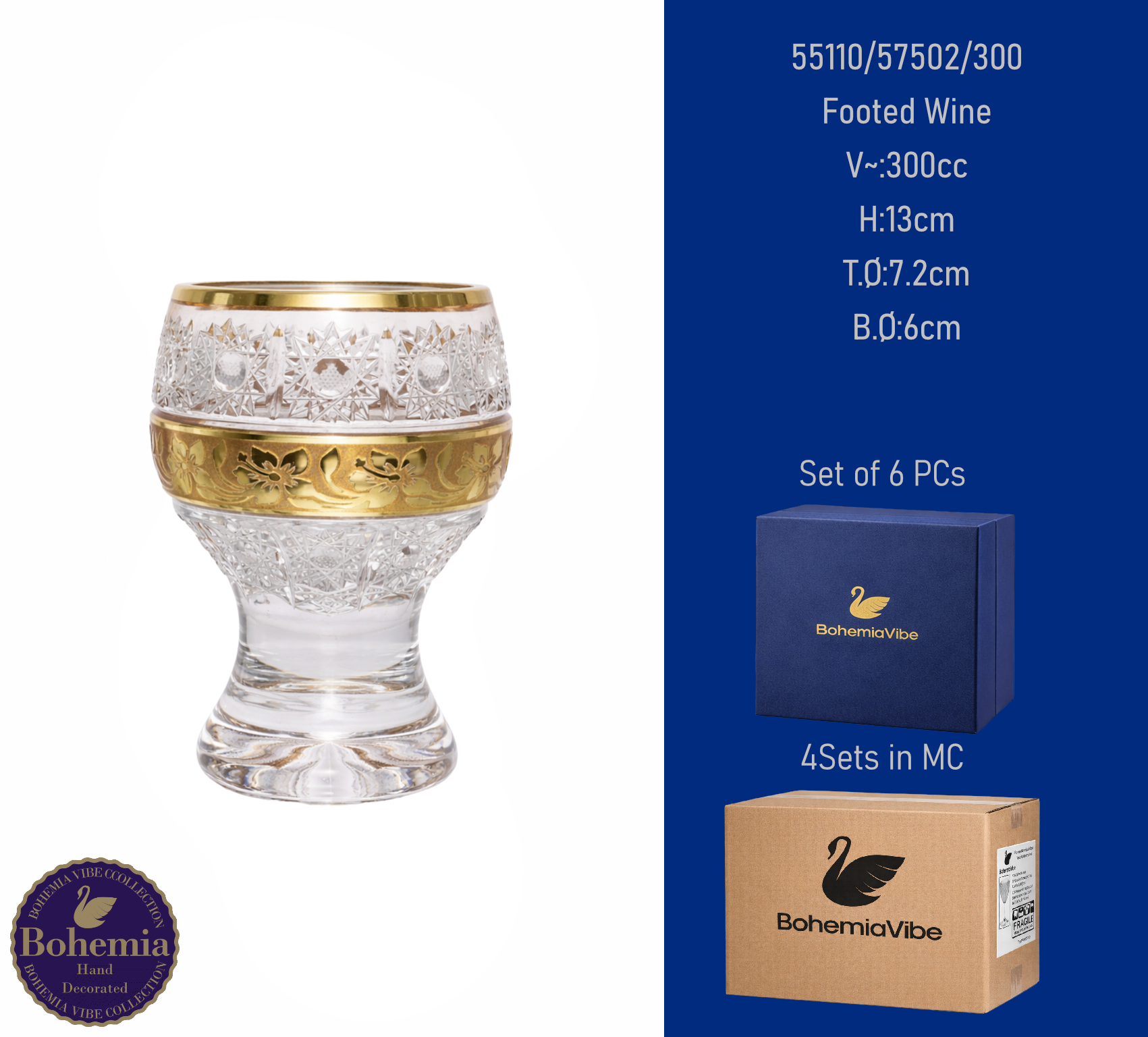 Footed Wine V~:300cc H:13cm T.Ø:7.2cm B.Ø:6cm PK500 cut with gold sandblasting