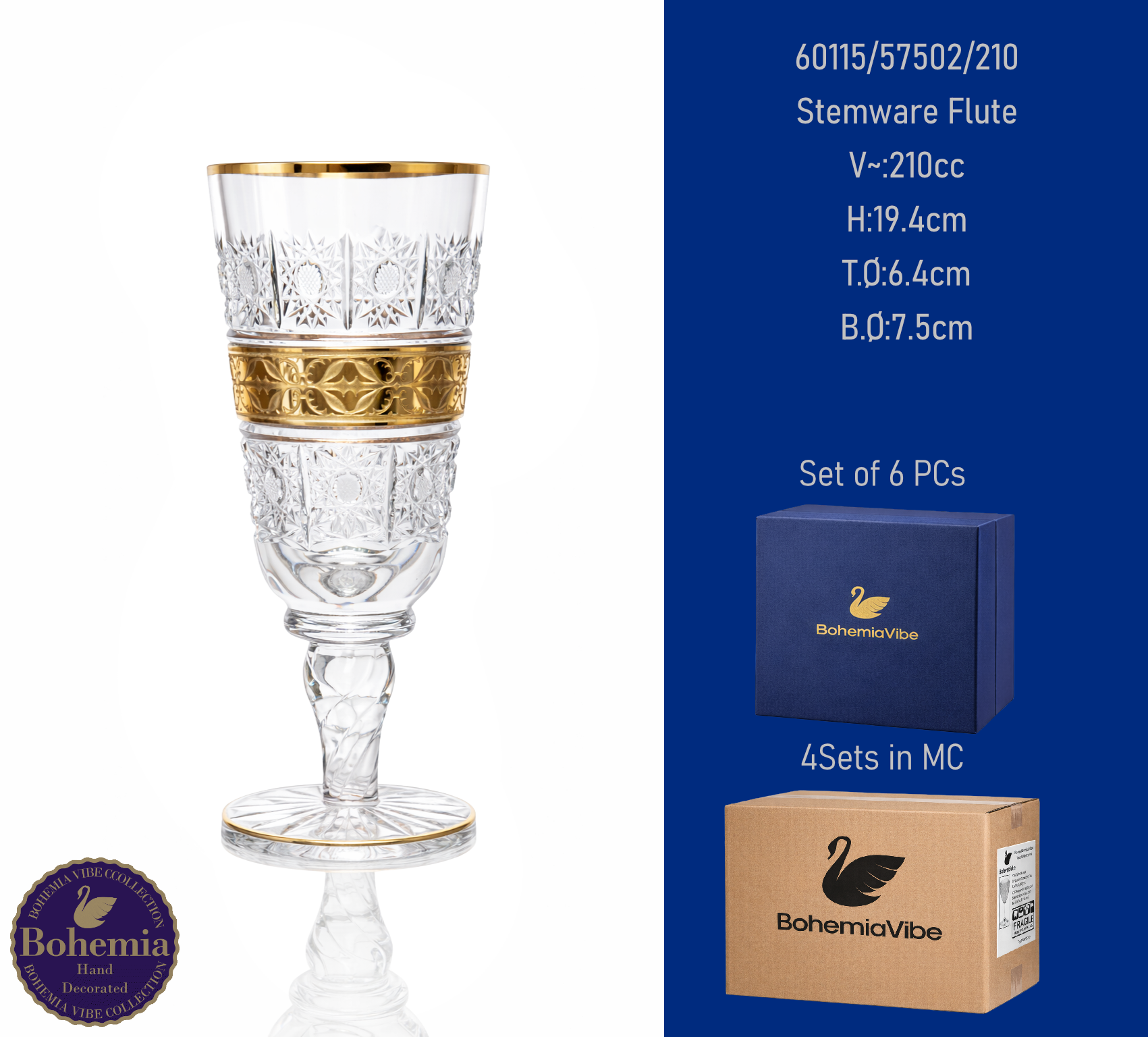 Stemware Flute V~:210cc H:19.4cm T.Ø:6.4cm B.Ø:7.5cm PK500 cut with gold sandblasting