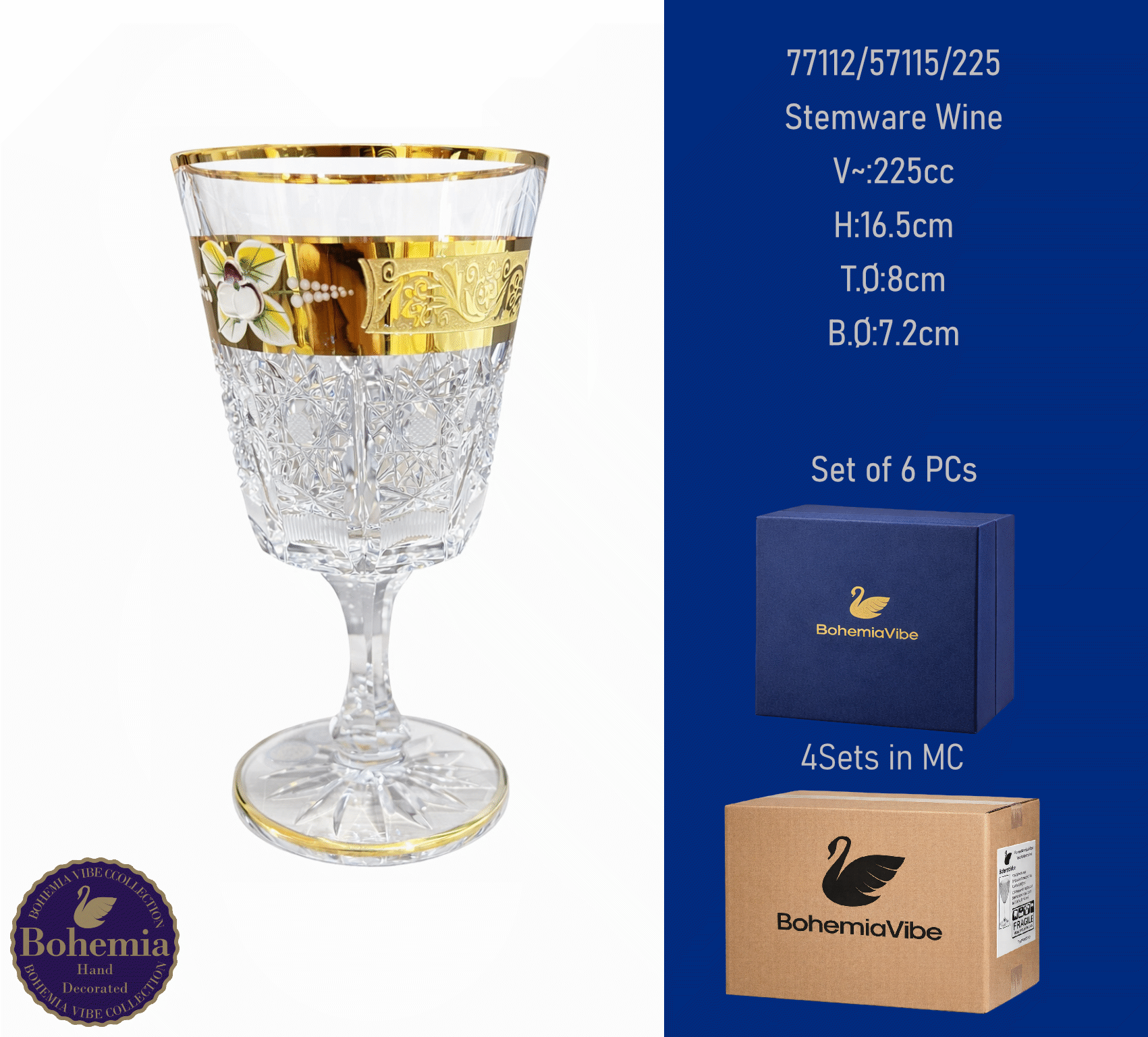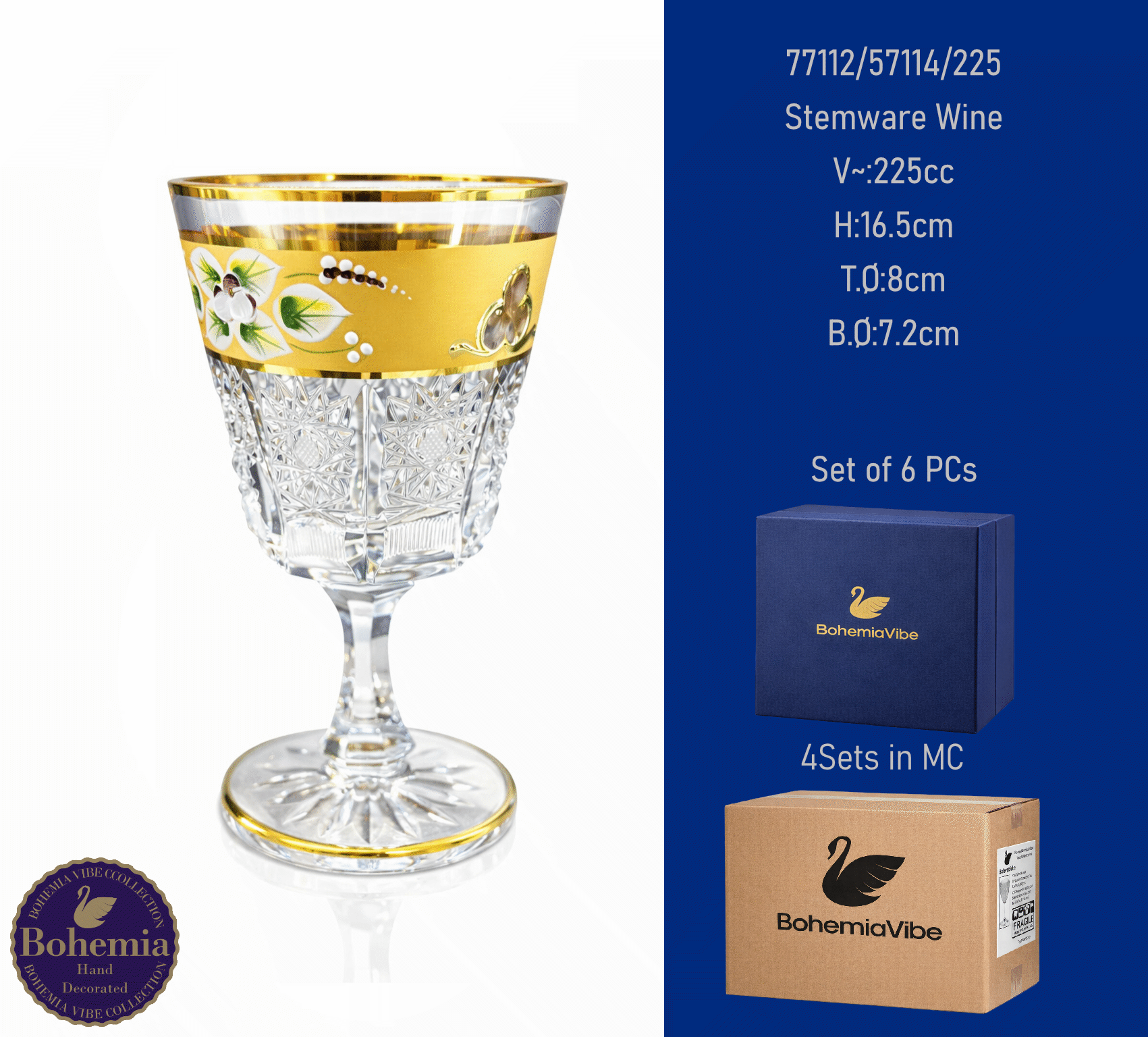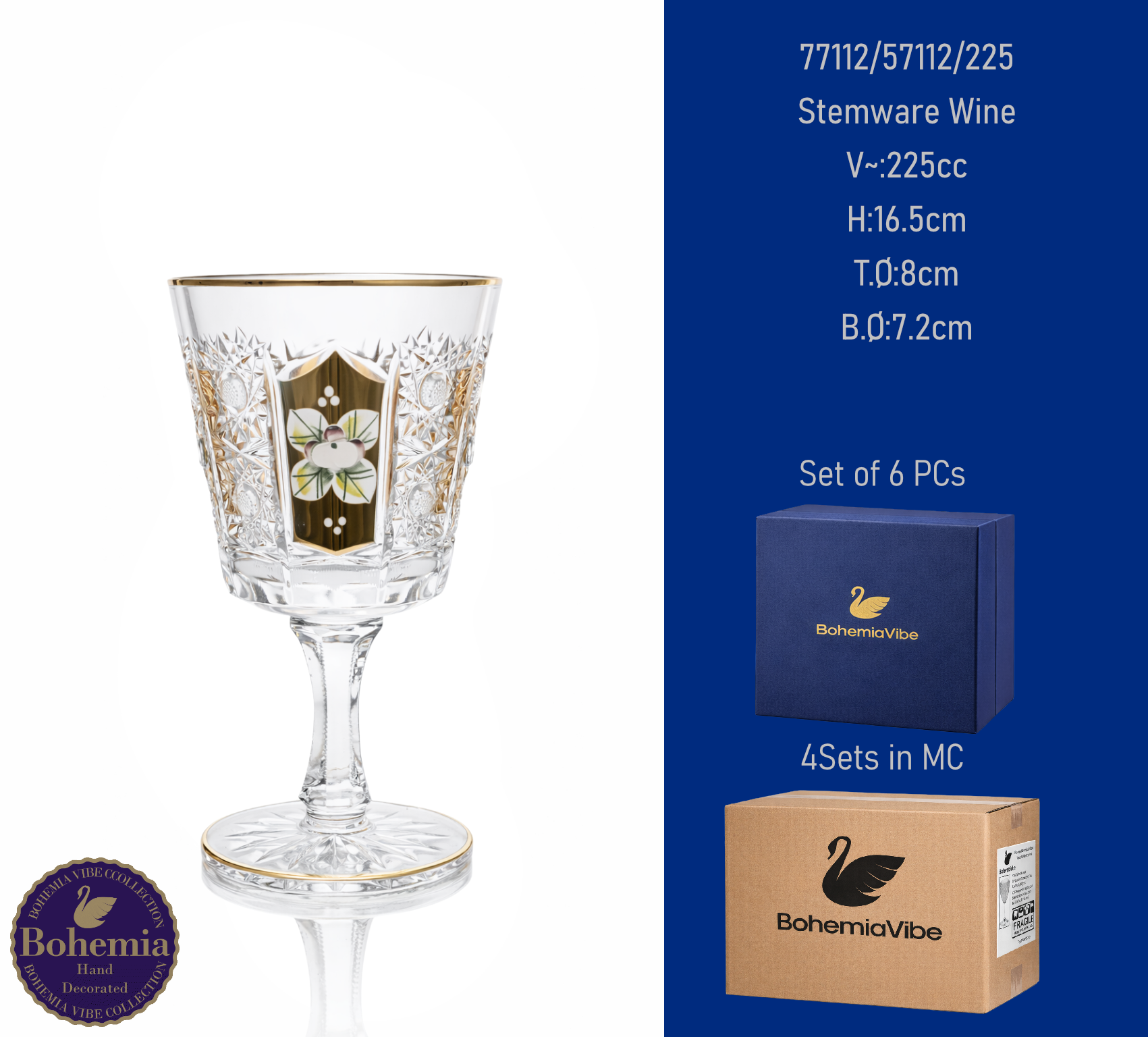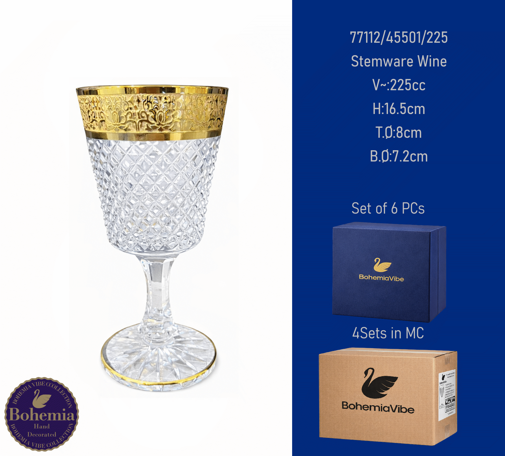 Stemware Wine V~:225cc H:16.5cm T.Ø:8cm B.Ø:7.2cm Cutting with gold sandblasting