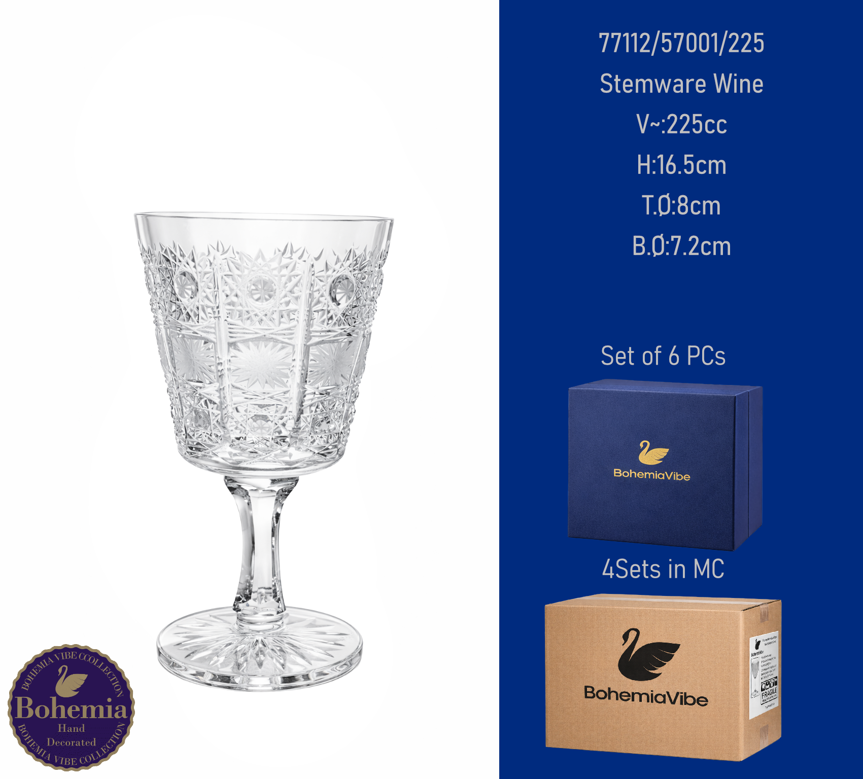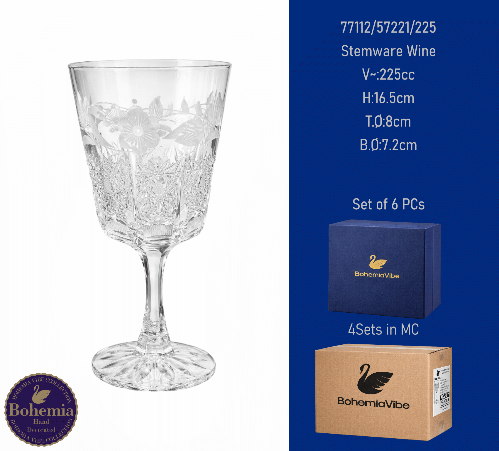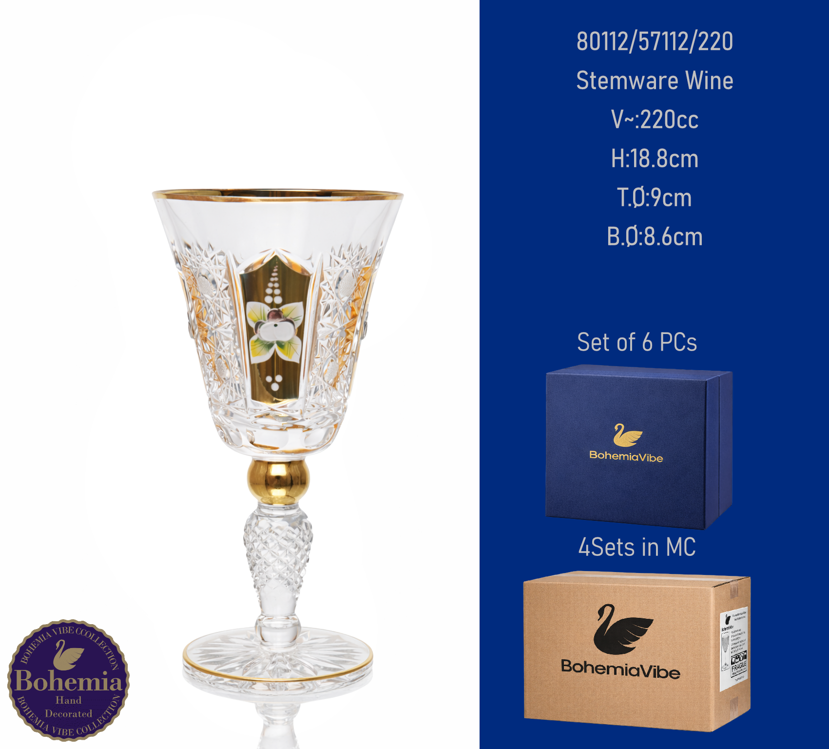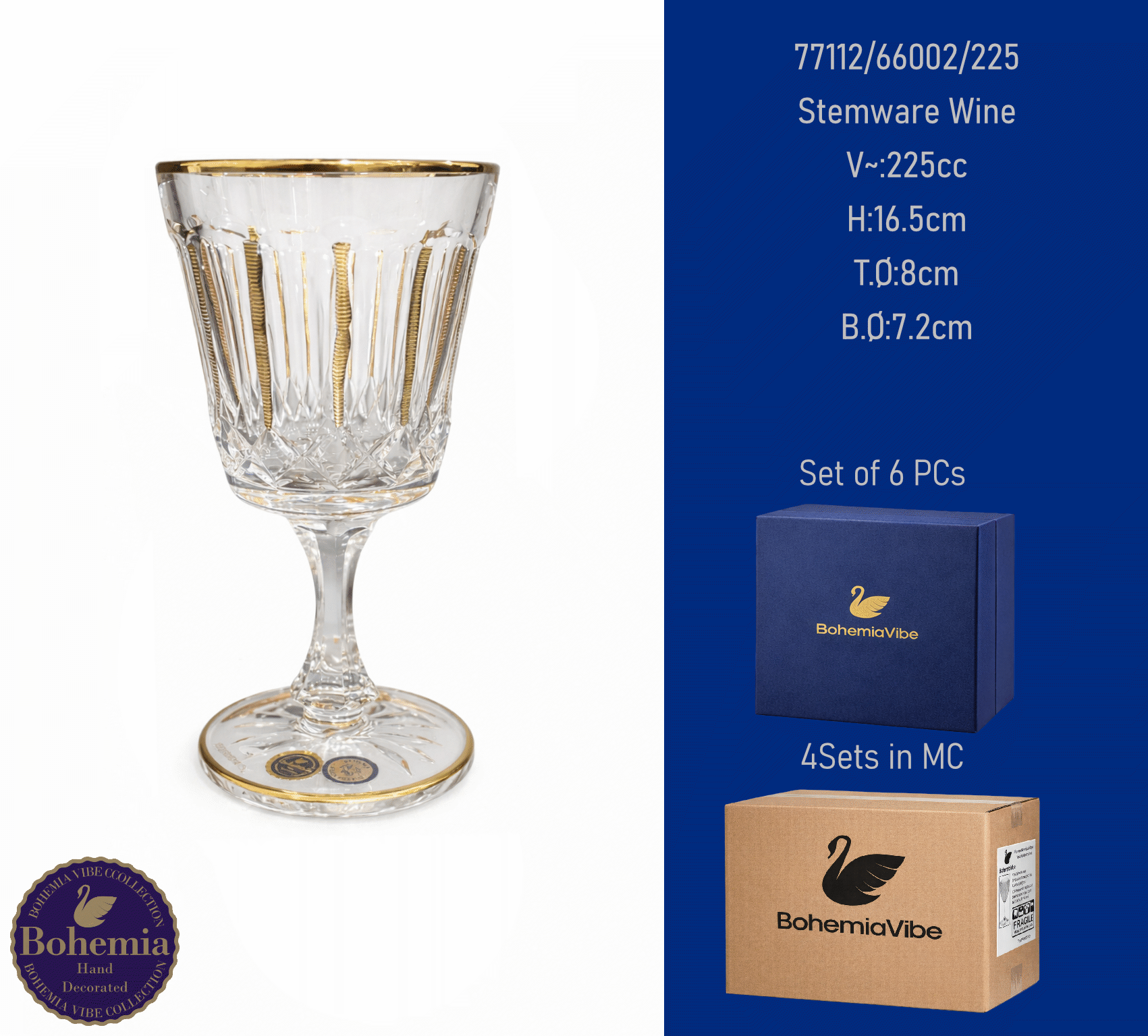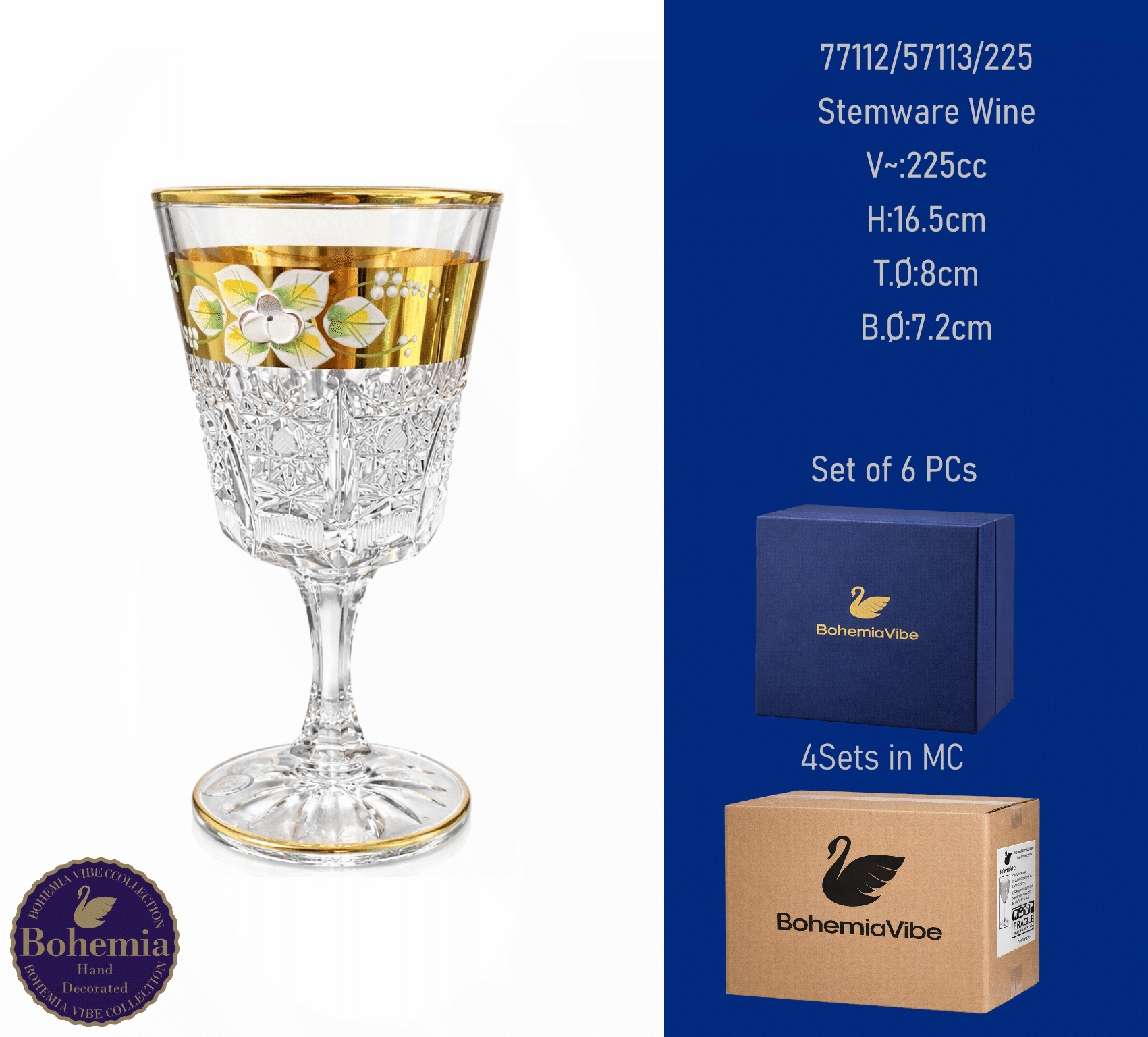 Stemware Wine V~:225cc H:16.5cm T.Ø:8cm B.Ø:7.2cm Cutting with gold sandblasting