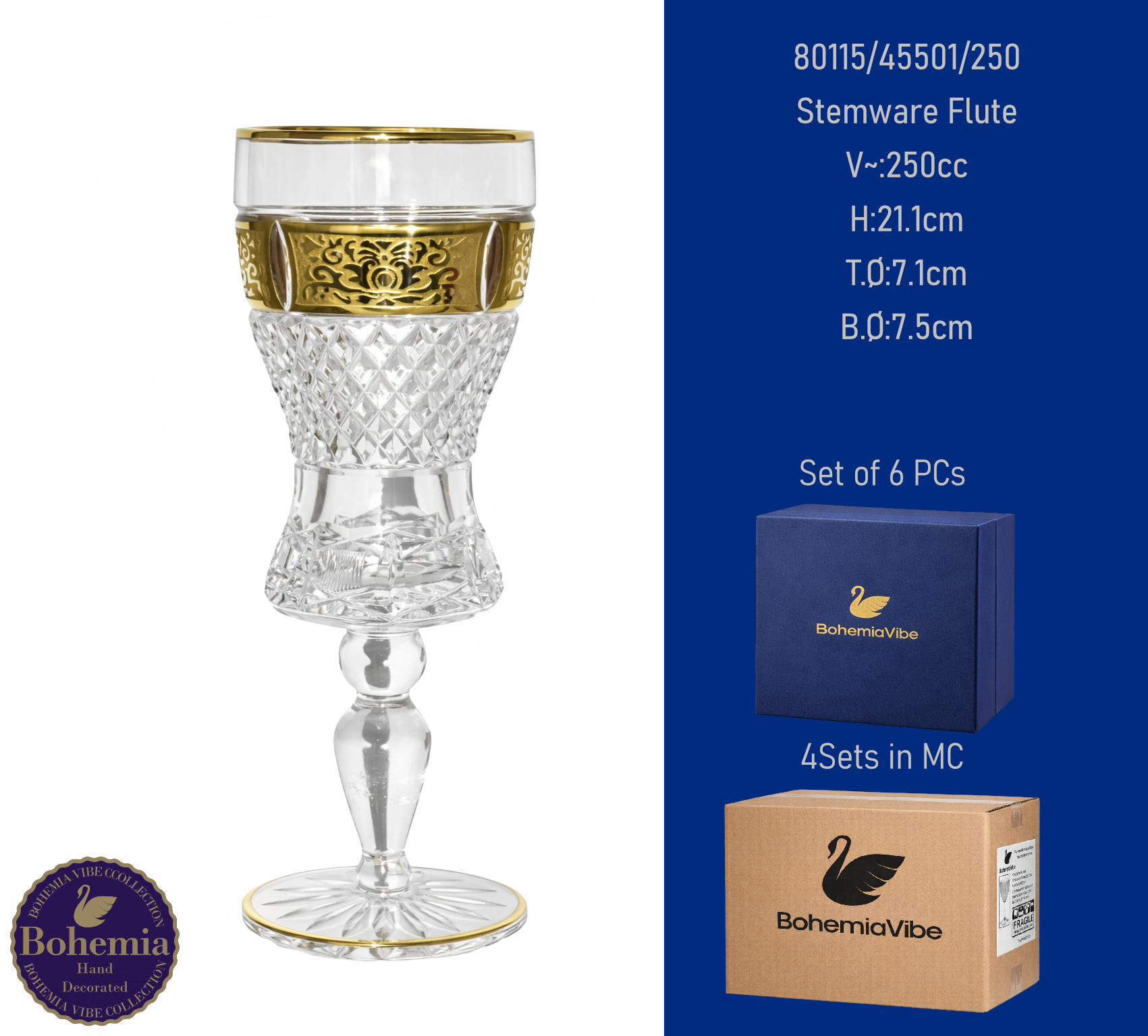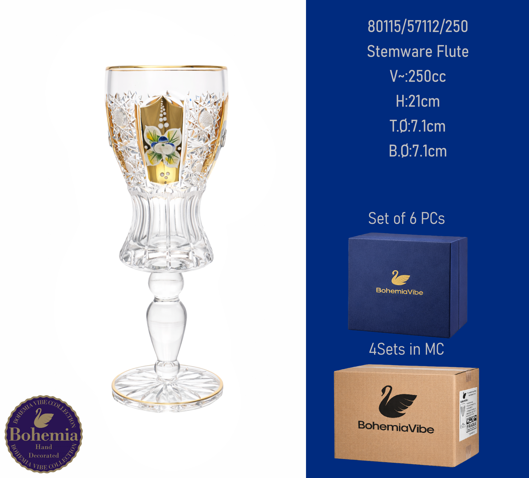 Stemware Flute V~:250cc H:21cm T.Ø:7.1cm B.Ø:7.1cm Cutting with gold sandblasting