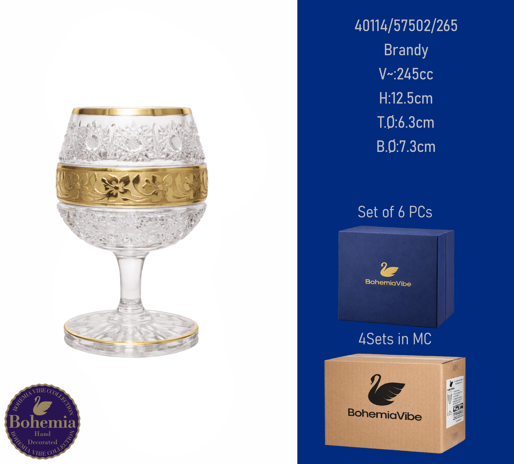 Brandy V~:265cc H:12.5cm T.Ø:6.2cm B.Ø:7.4cm PK500 cut with gold sandblasting