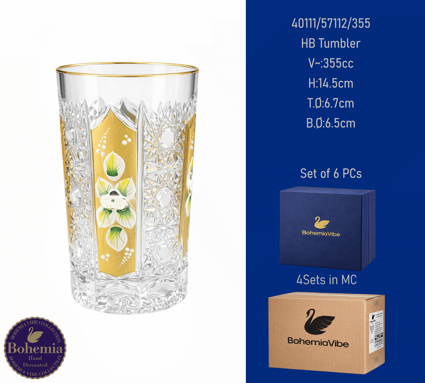 HB Tumbler V~:355cc H:14.5cm T.Ø:6.7cm B.Ø:6.5cm PK500 cut with gold and enamel painting vertical