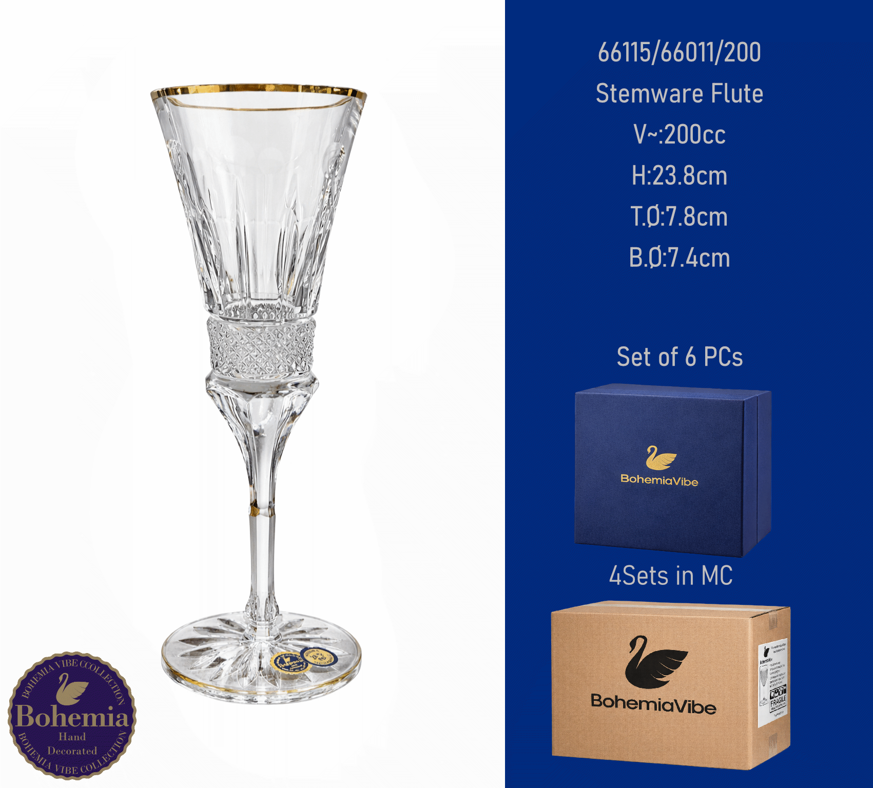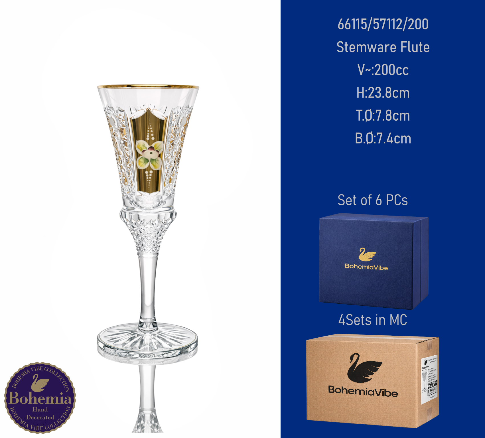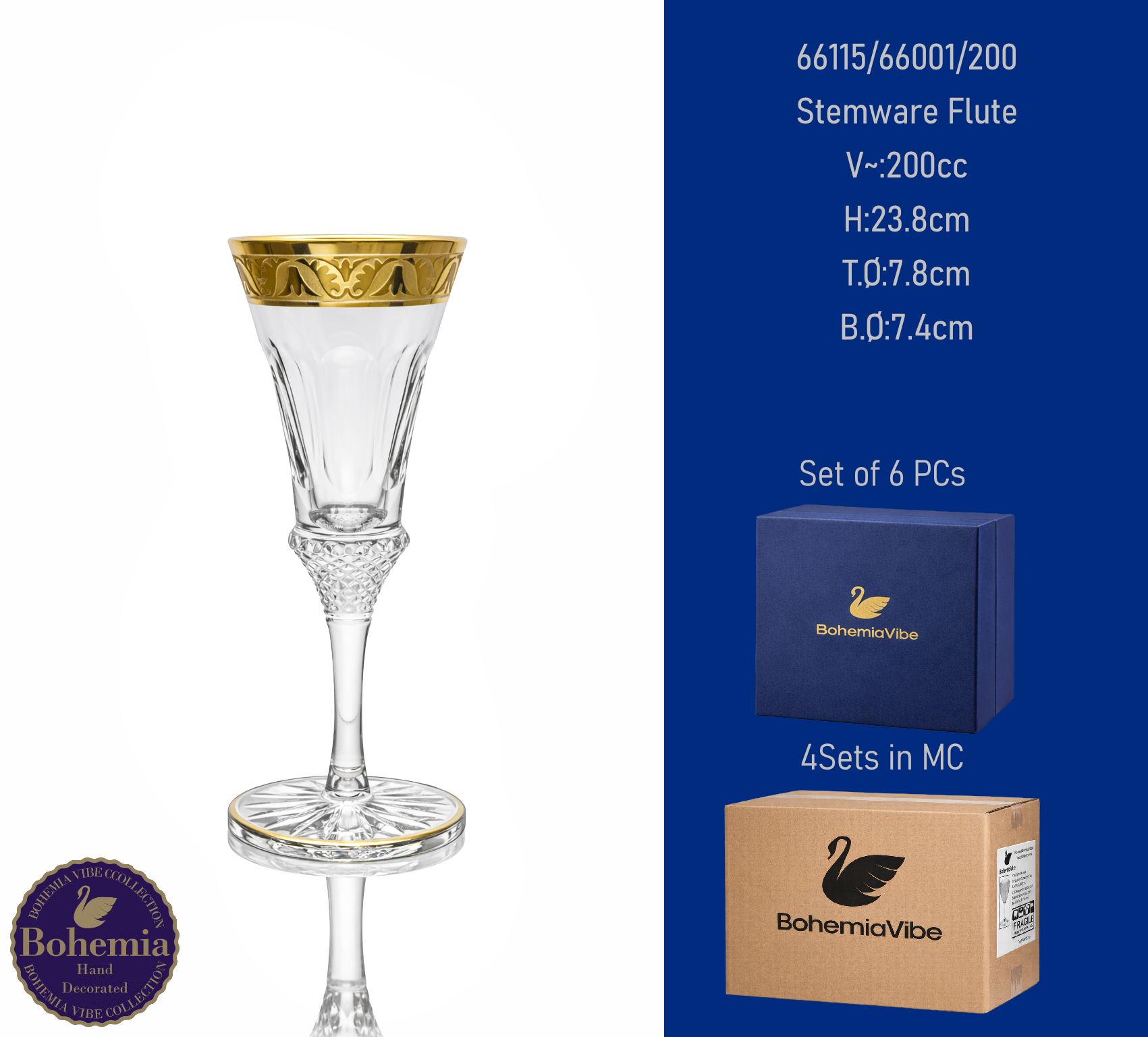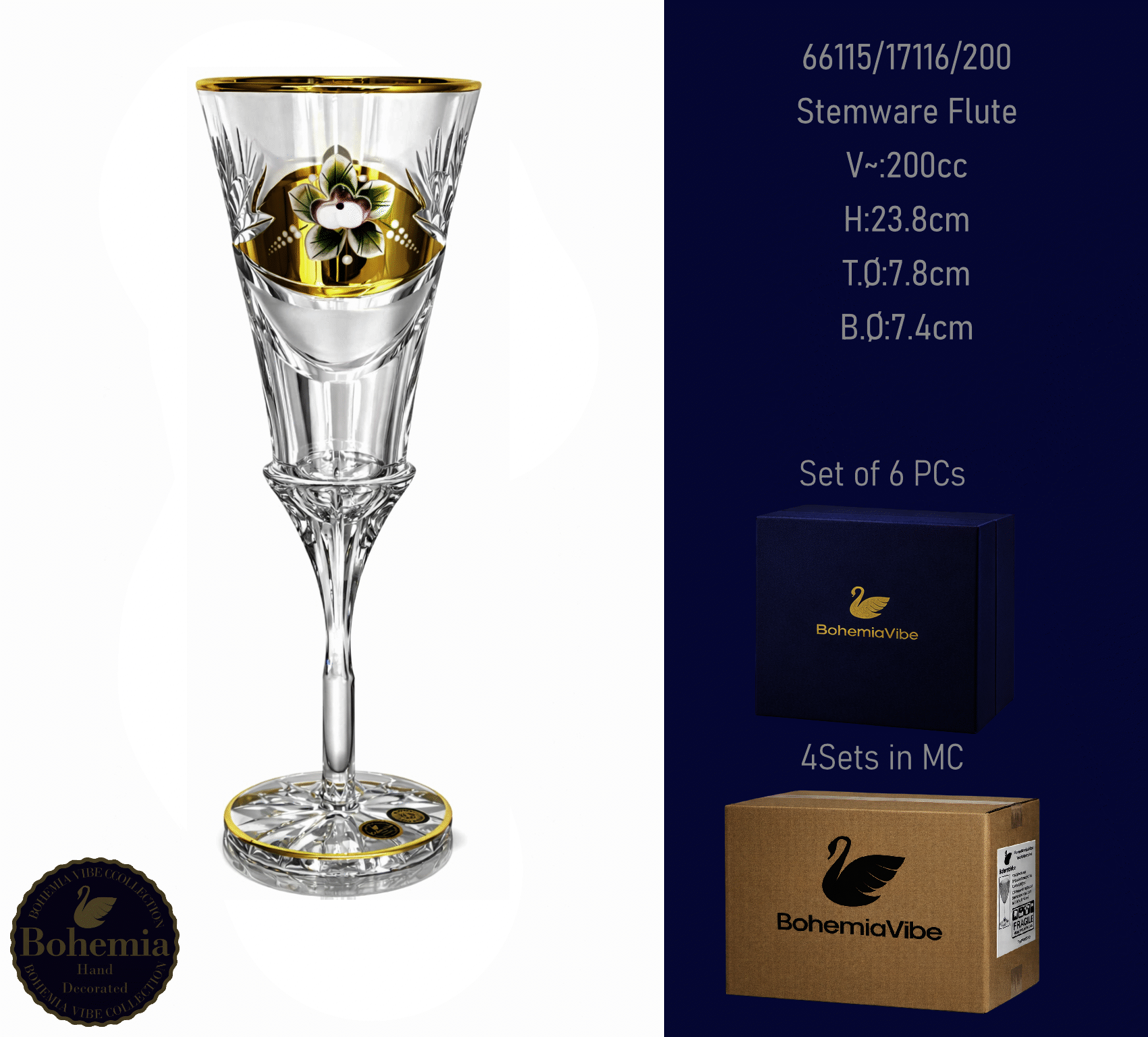 Stemware Flute V~:200cc H:23.8cm T.Ø:7.8cm B.Ø:7.4cm Cutting with gold sandblasting