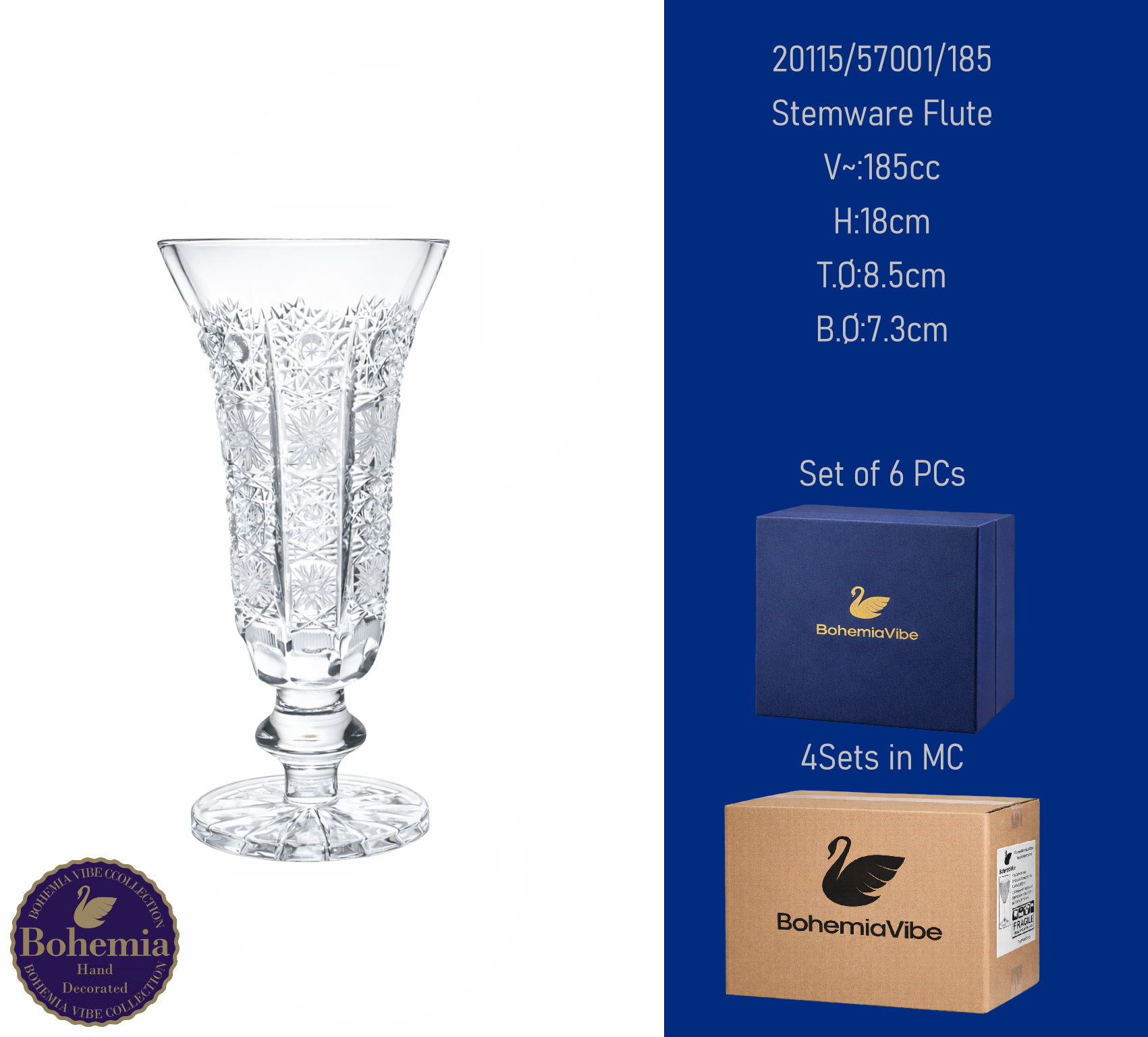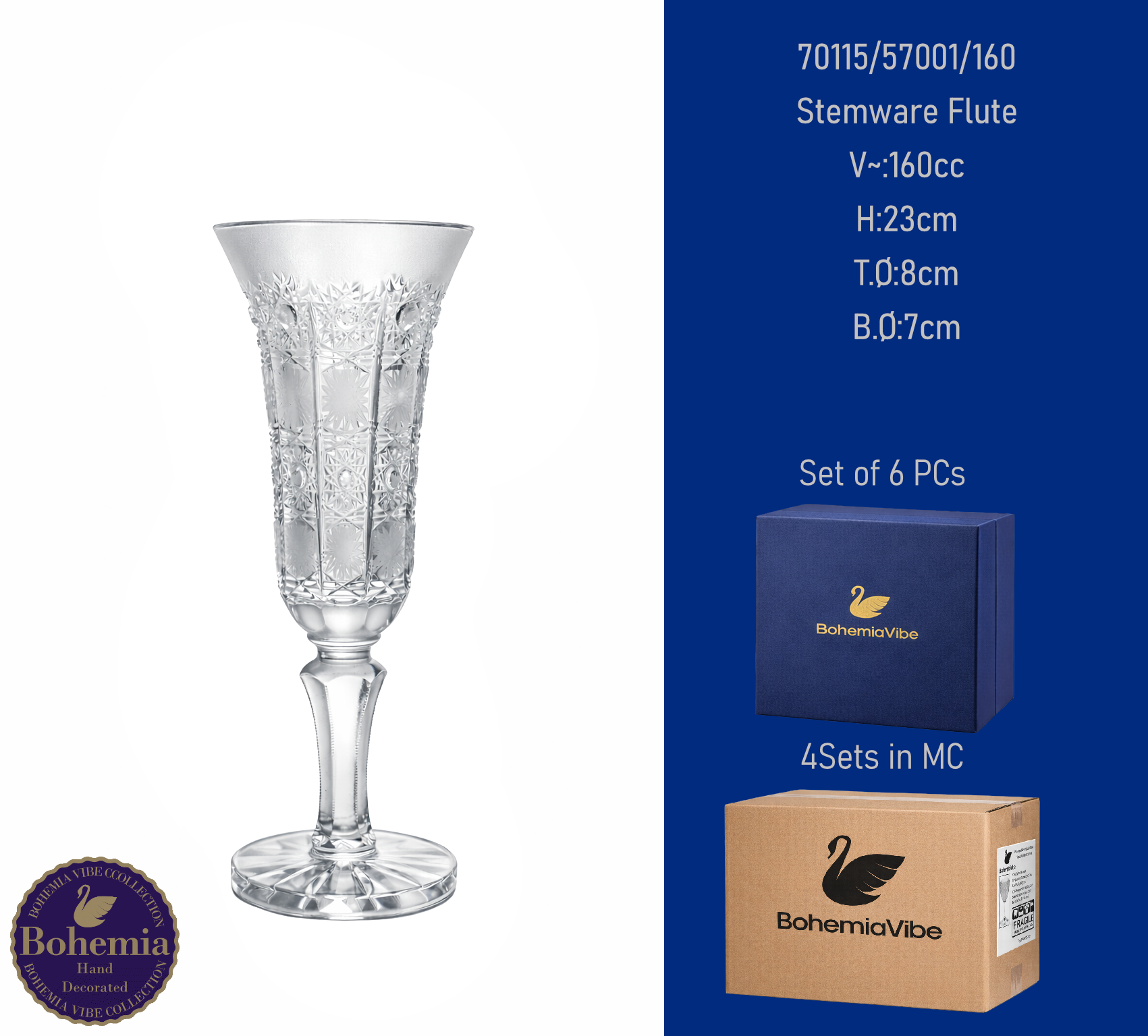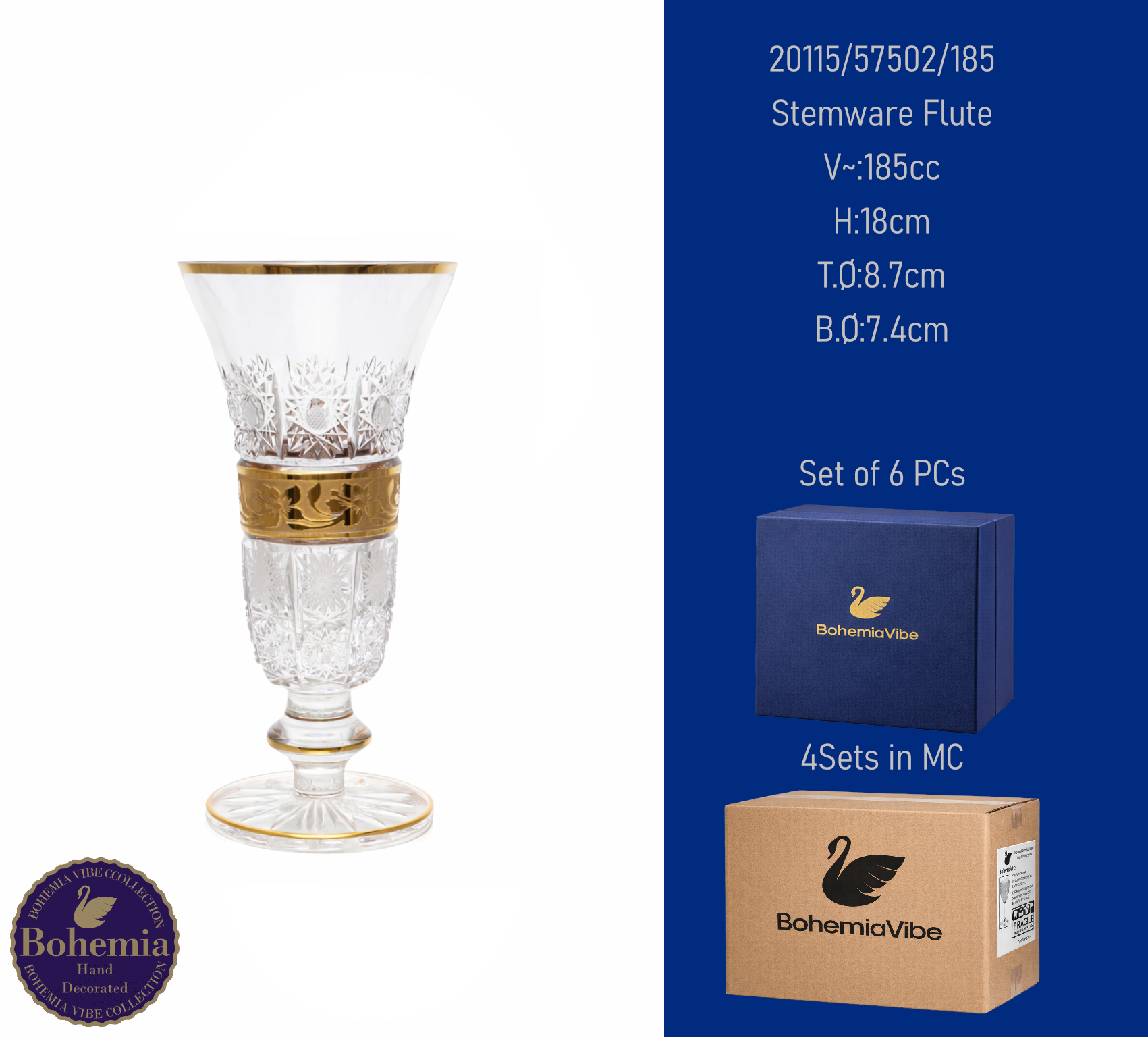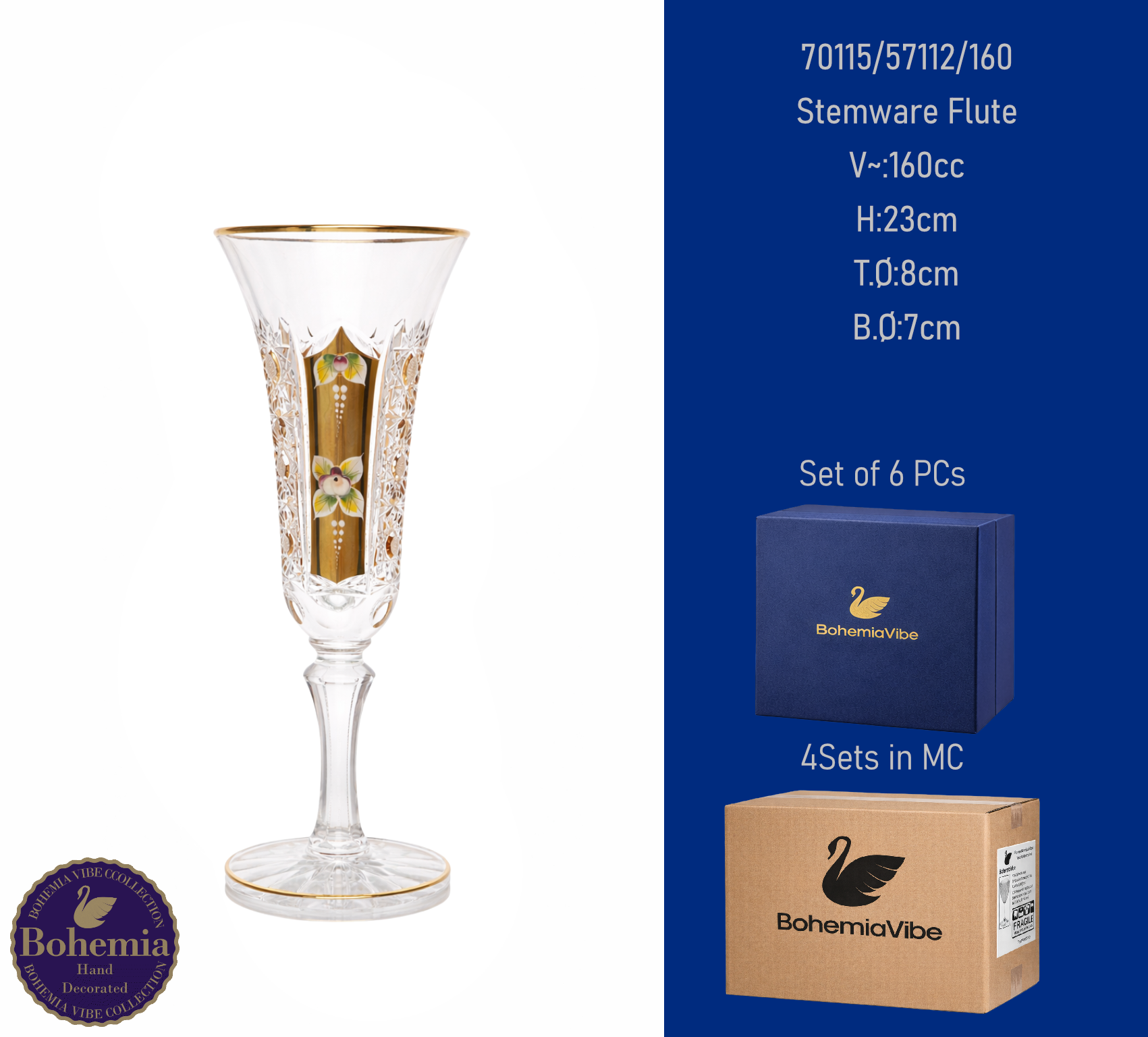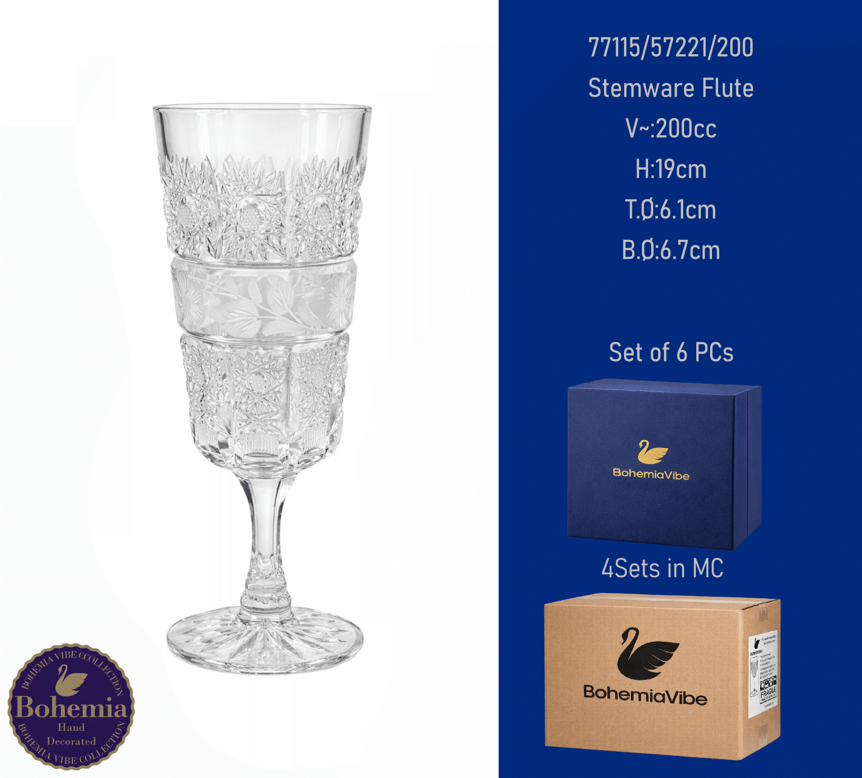 Stemware Flute V~:200cc H:23.8cm T.Ø:7.8cm B.Ø:7.4cm Cutting with gold sandblasting