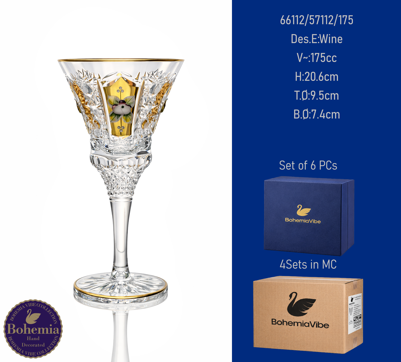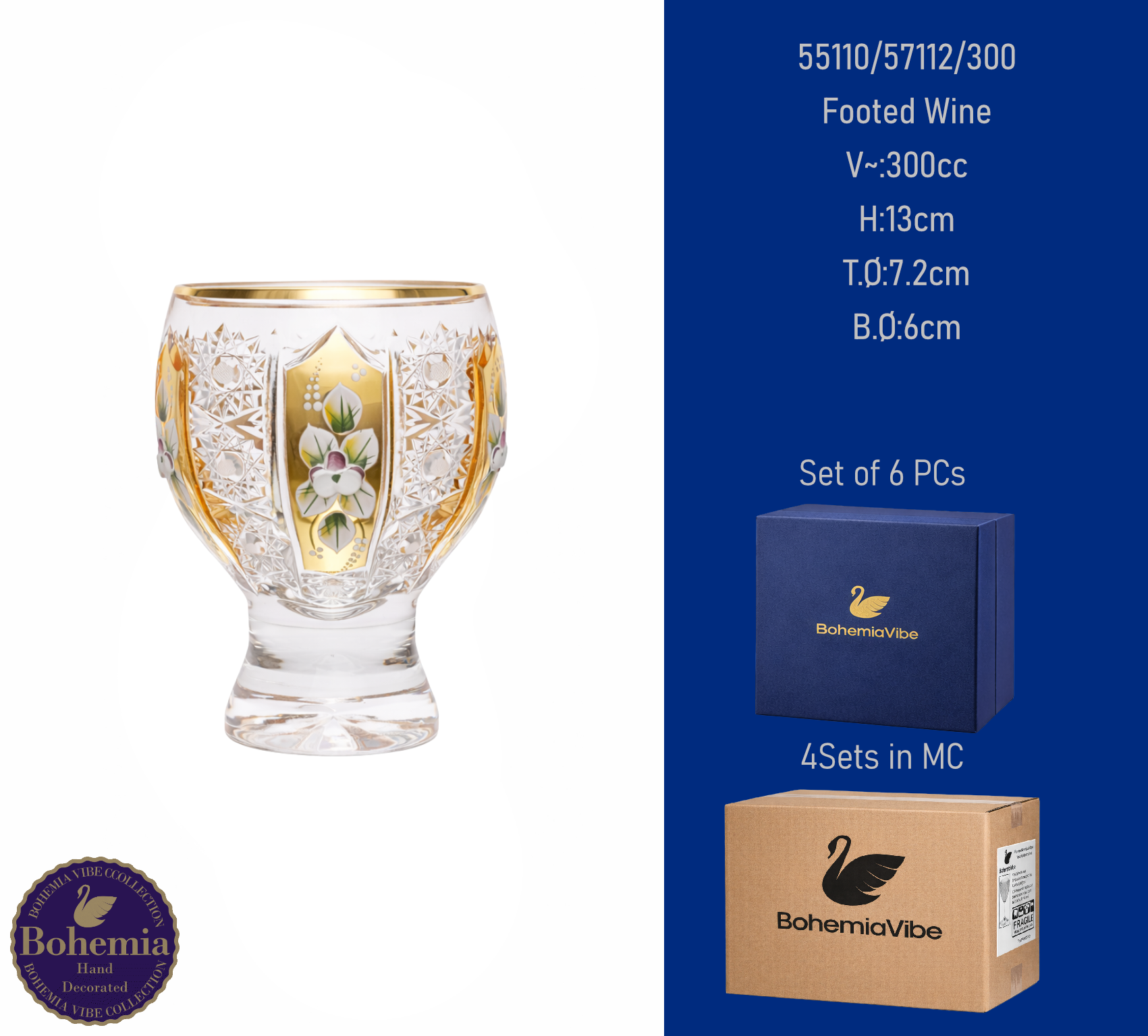 Footed Wine V~:300cc H:13cm T.Ø:7.2cm B.Ø:6cm PK500 cut with gold and enamel painting vertical