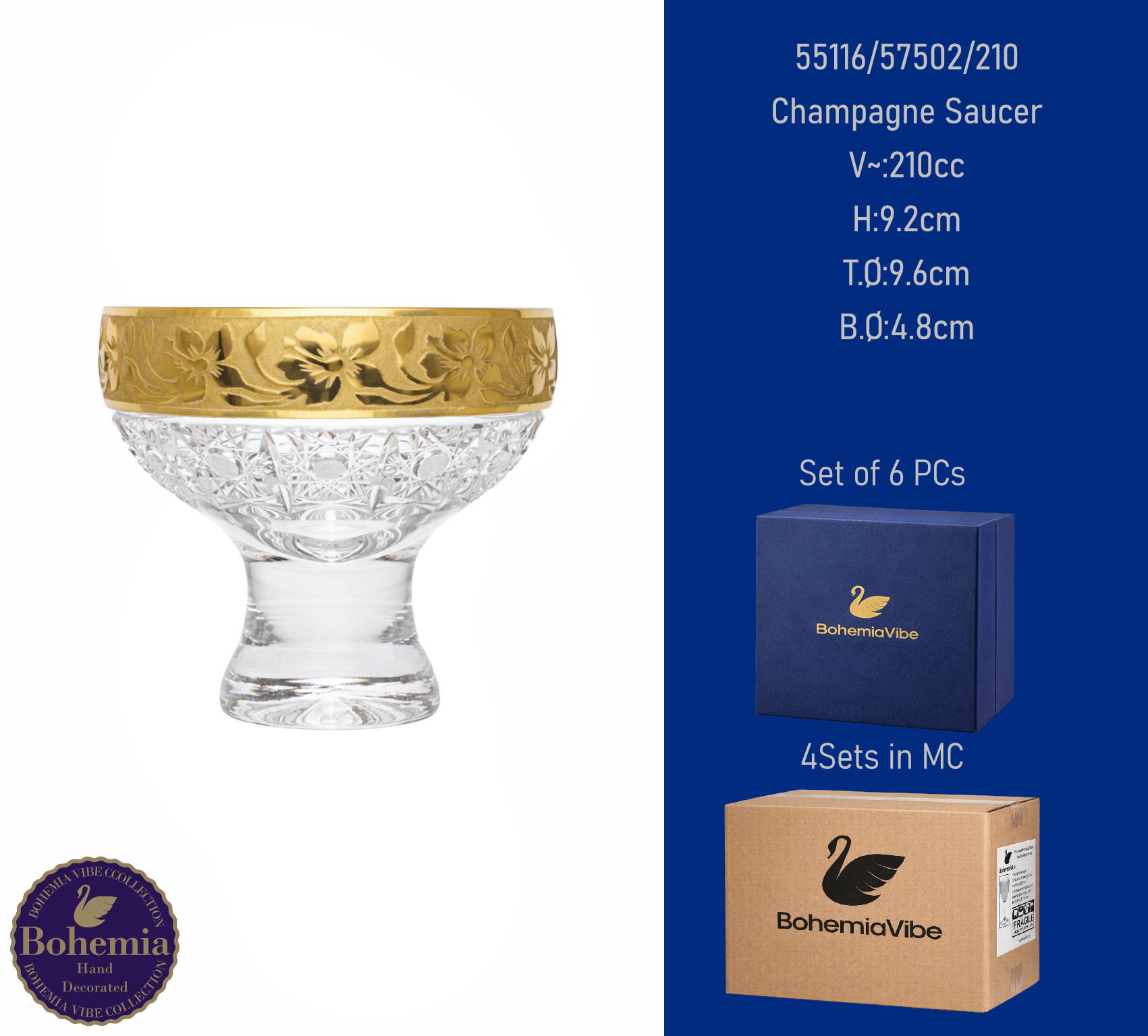 Champagne Saucer V~:210cc H:9.2cm T.Ø:9.5cm B.Ø:5cm PK500 cut with gold sandblasting