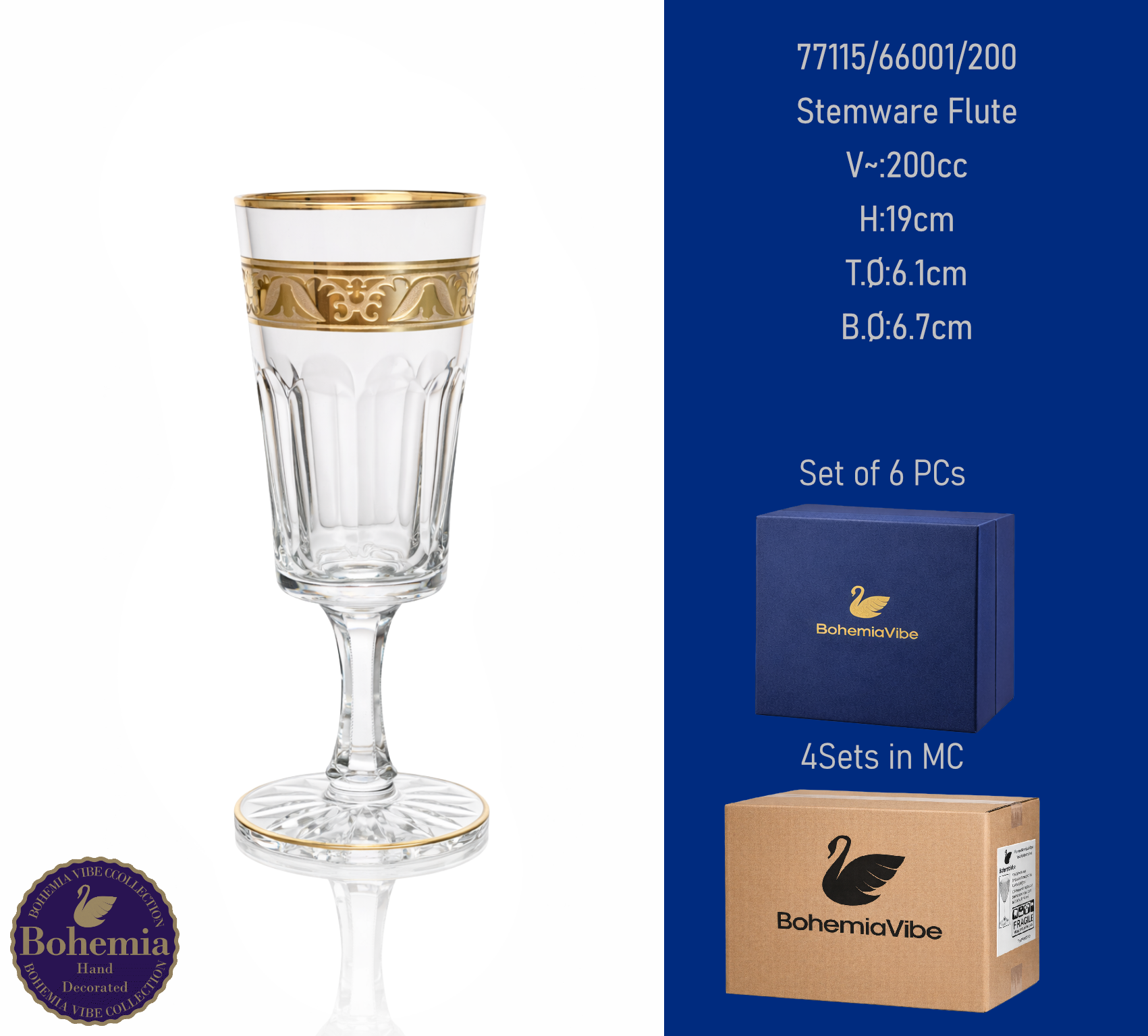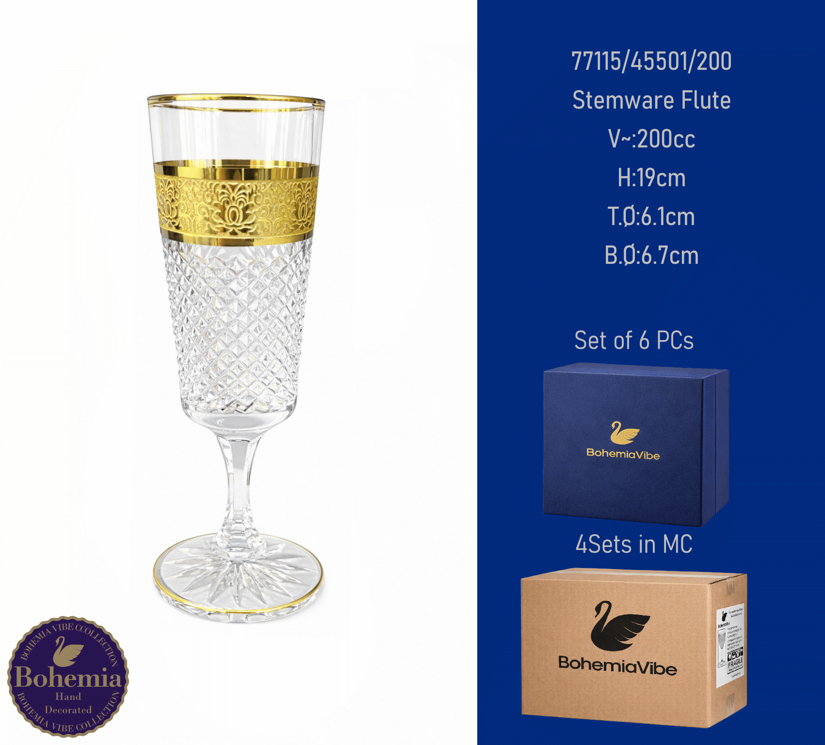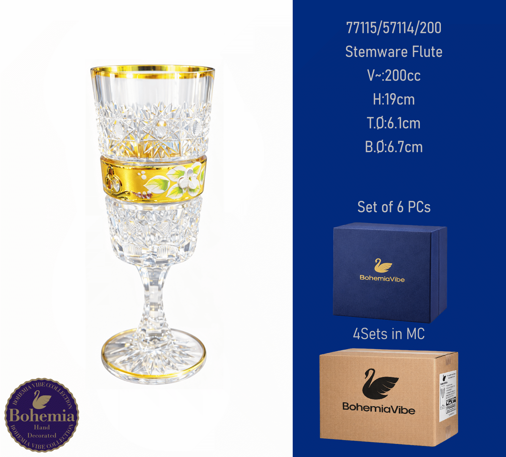 Stemware Flute V~:200cc H:19cm T.Ø:6.1cm B.Ø:6.7cm Cutting with gold sandblasting