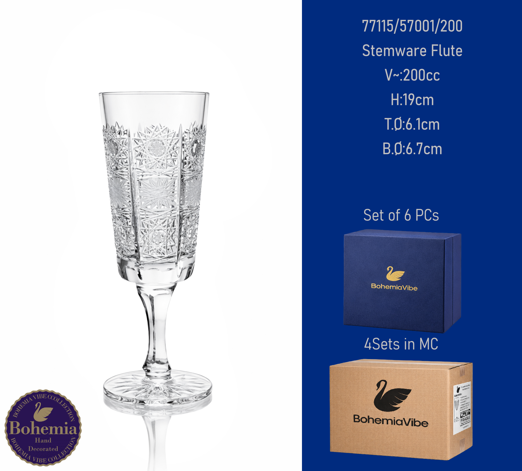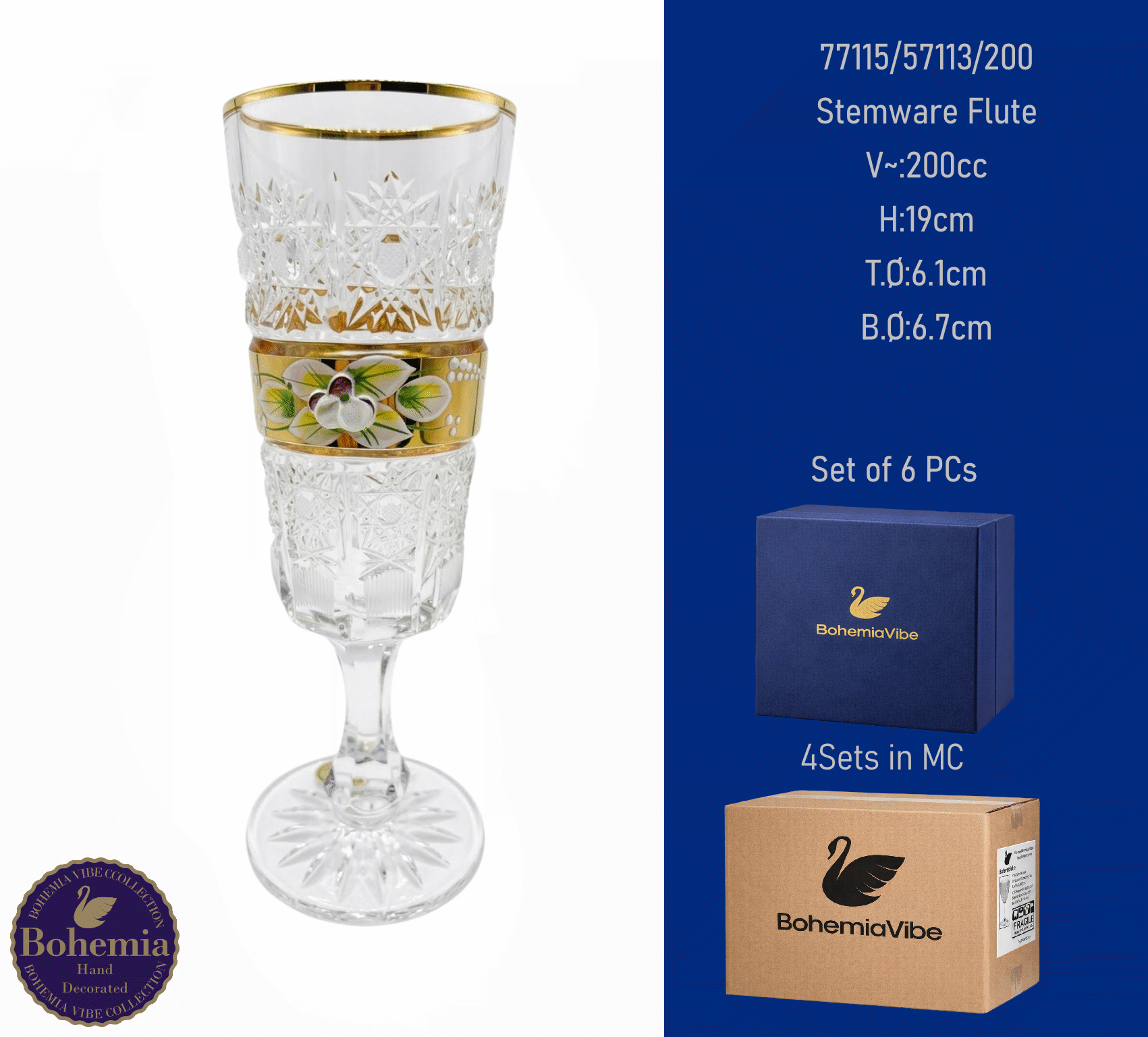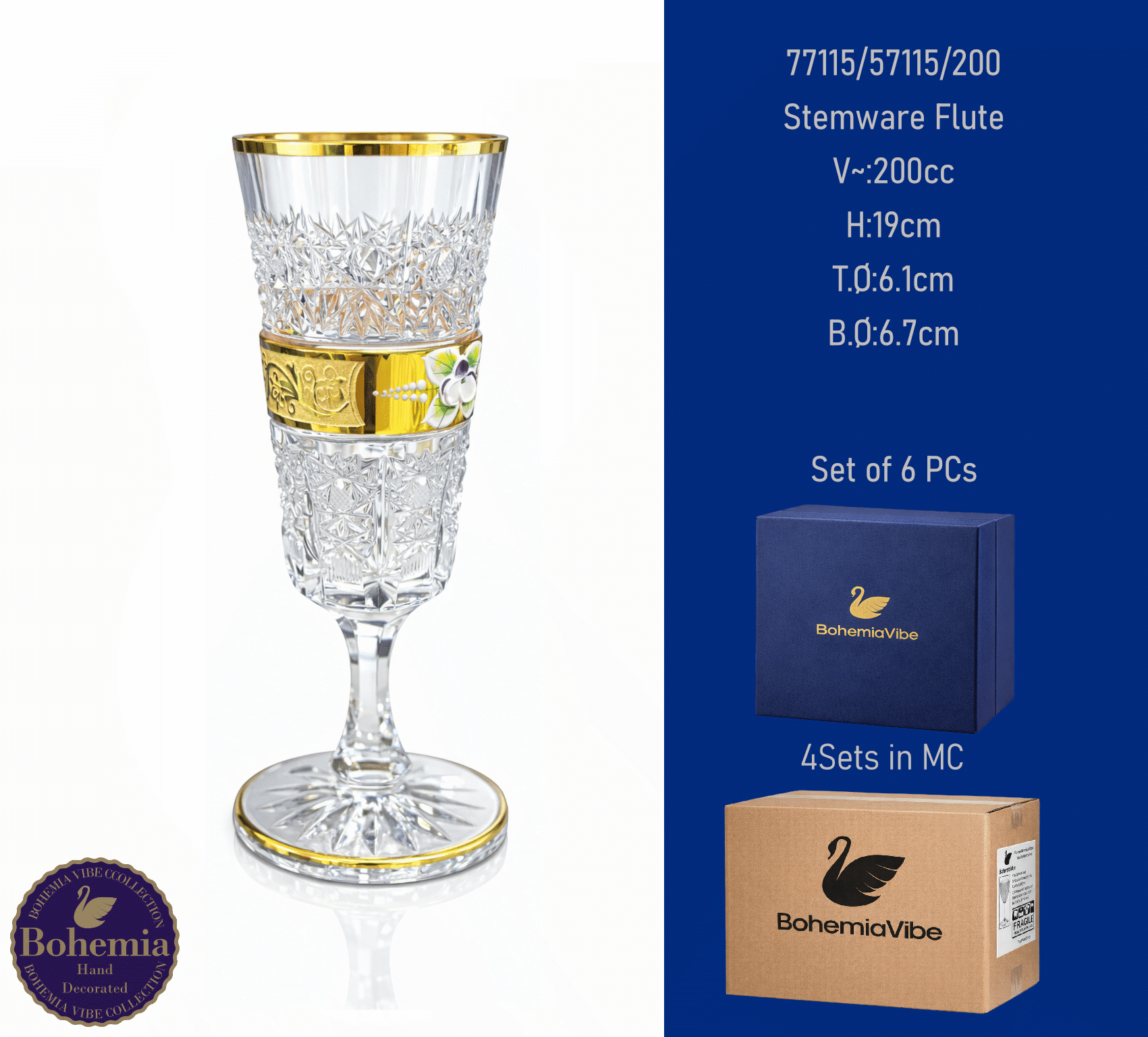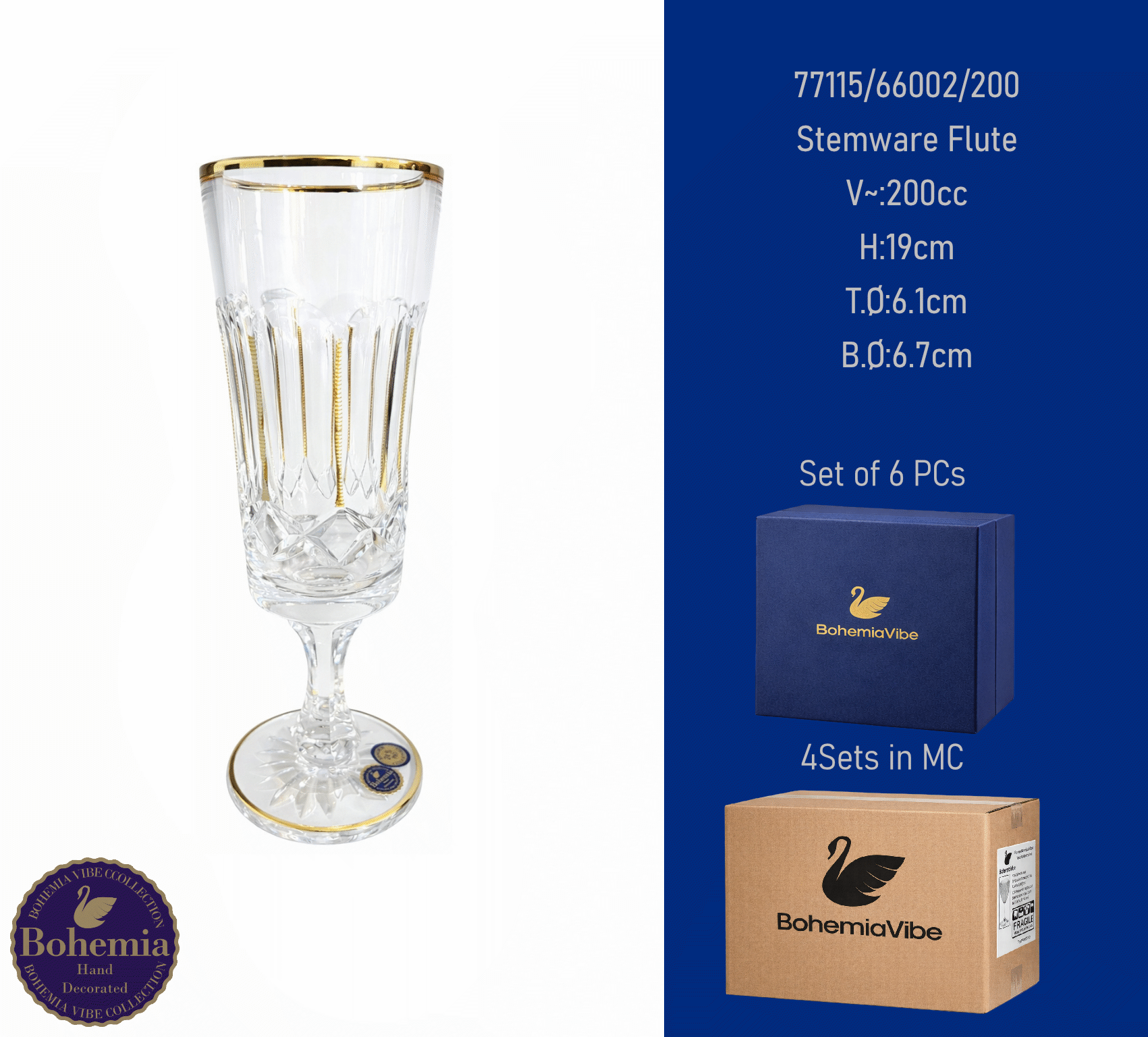 Stemware Flute V~:200cc H:19cm T.Ø:6.1cm B.Ø:6.7cm Cutting with gold sandblasting