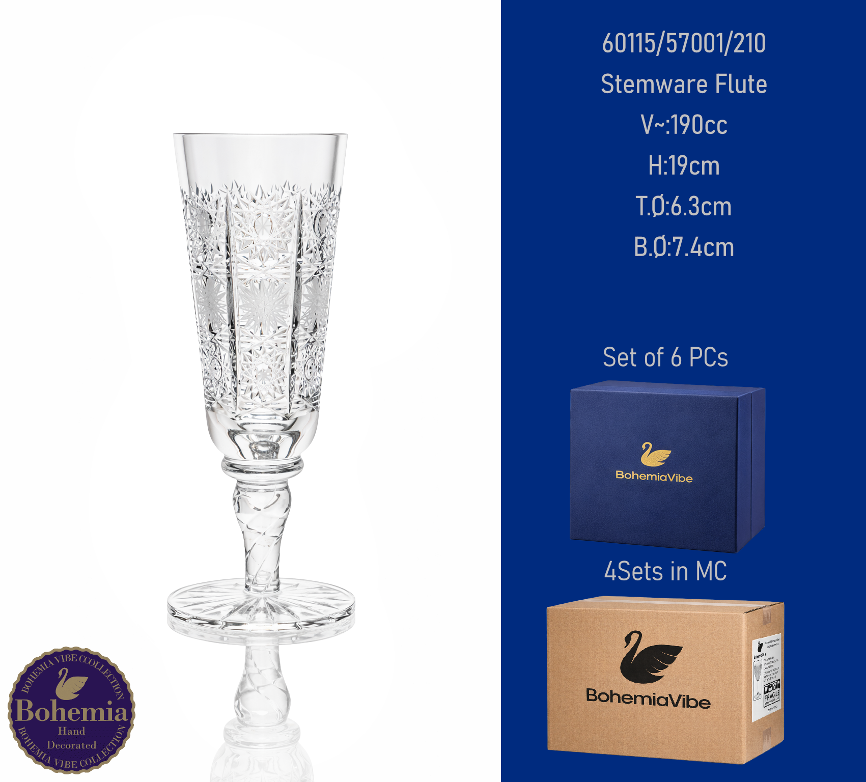 Stemware Flute V~:210cc H:19.4cm T.Ø:6.4cm B.Ø:7.5cm PK500 cut
