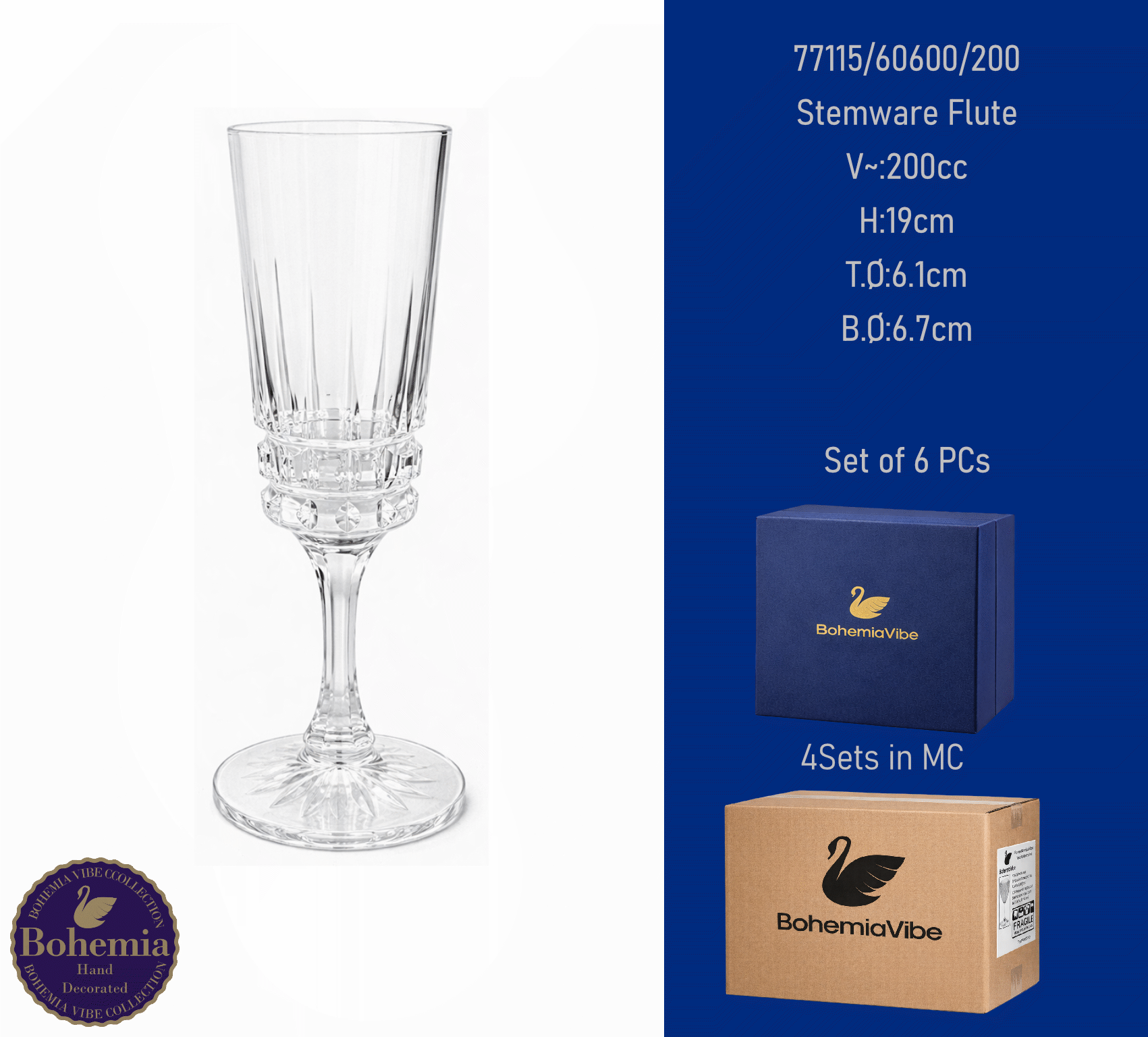 Stemware Flute V~:200cc H:19cm T.Ø:6.1cm B.Ø:6.7cm Modern cutting